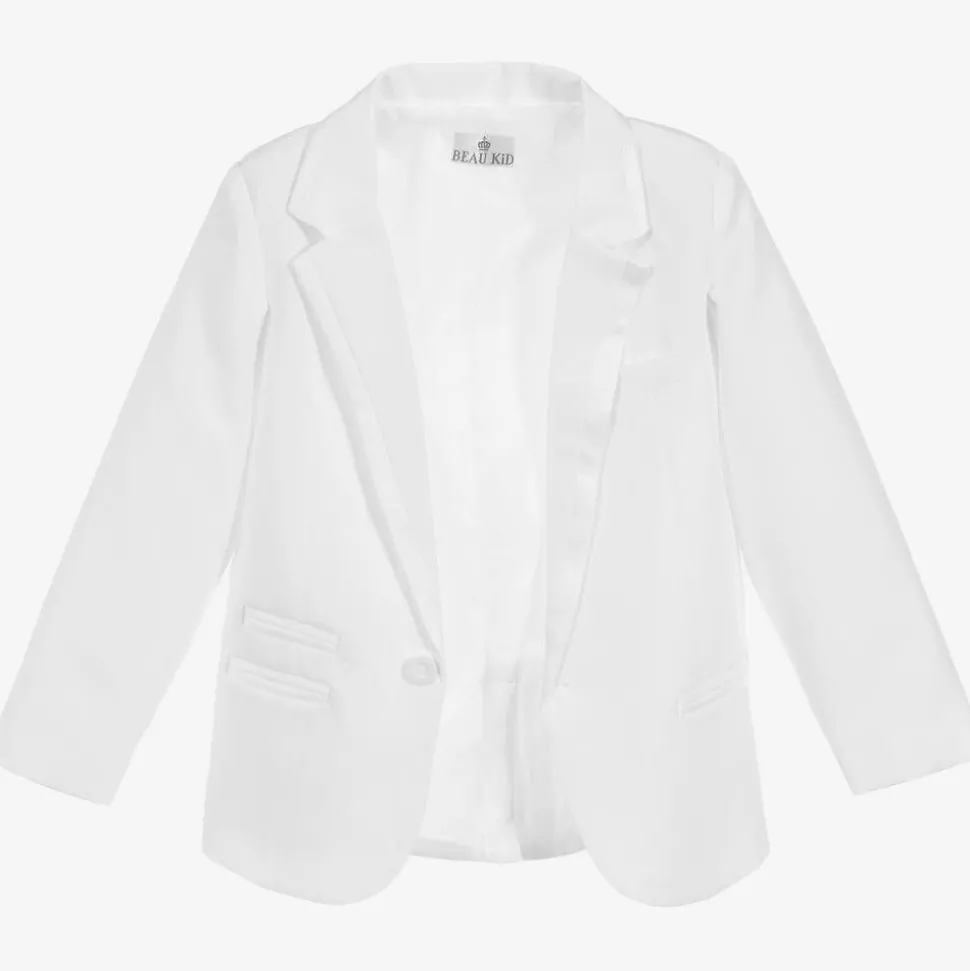Boys white, special occasion, five-piece tuxedo by Beau KiD. The jacket and trousers have a satin trim, matching the cummerbund and bow tie. The white polycotton shirt has pin tucks on the front and two sets of button fastenings, one set is in pearlised white and can be removed.