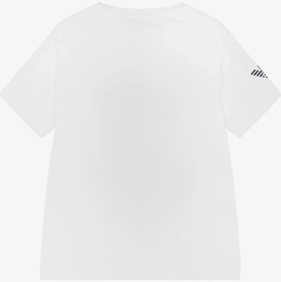 A white sports T-shirt for boys by Italian brand EA7 Emporio Armani, part of the brand's Tennis Pro collection. Made in lightweight and breathable Ventus7 technical fabric, it is moisture-wicking and body temperature regulating, with anti-abrasion seams to prevent discomfort during movement. There is a black EA7 logo print on the chest and an Eagle logo on one sleeve.