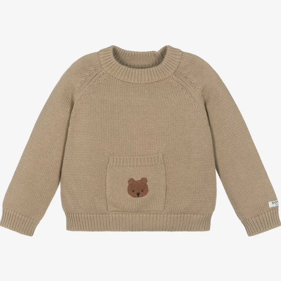 Cute brown sweater for little boys and girls by Donsje, knitted in soft cotton. It has a sweet pocket on the front, embroidered with a teddy bear for an adorable look. The neckline, cuffs and hem are ribbed for comfortable wear.