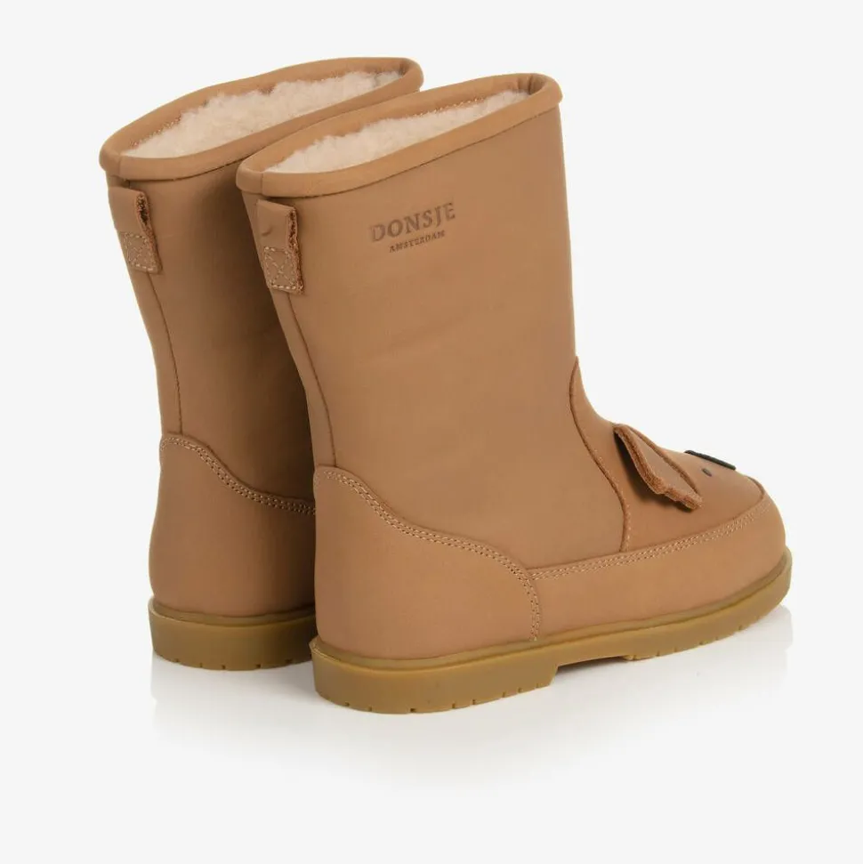 Brown boots for boys and girls by Donsje, handmade in soft leather. Adorable to wear on colder days, these shoes are lined in beautifully cosy wool and have a sturdy, non-slip outer sole. For added character, they have cute koala faces on the front with 3D ear appliqués.