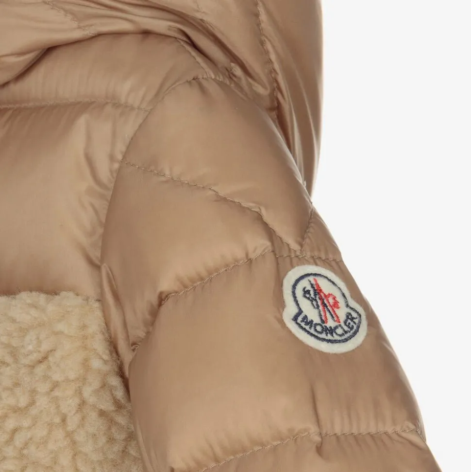Cute dark beige hooded puffer coat for little boys and girls by luxury brand Moncler Enfant. Padded with lightweight down for superior warmth, the jacket has a silky smooth exterior with beautifully soft teddy fleece panelling. Lined in comfortable cotton jersey, it fastens easily with a branded zip and has popper-fastening pockets. For a signature finish, the designer's instantly recognisable logo patch can be seen on one sleeve.