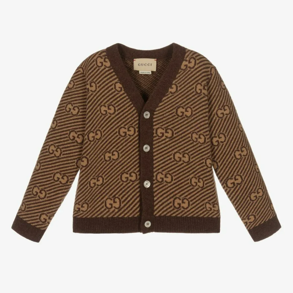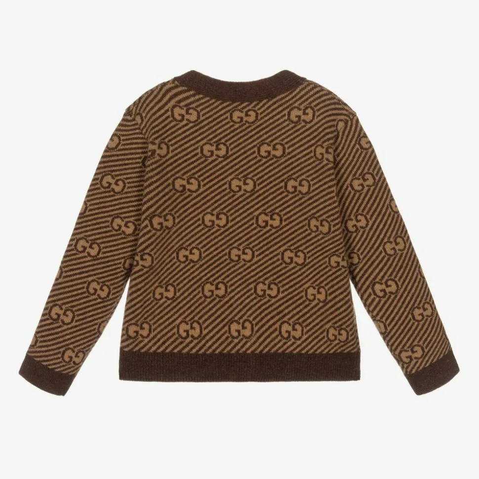 Baby boys and girls brown and camel Mini-me wool cardigan by Gucci. Beautifully soft and warm, the jacquard knit has a diagonal GG stripe pattern and there are mother-of-pearl buttons on the front to fasten.