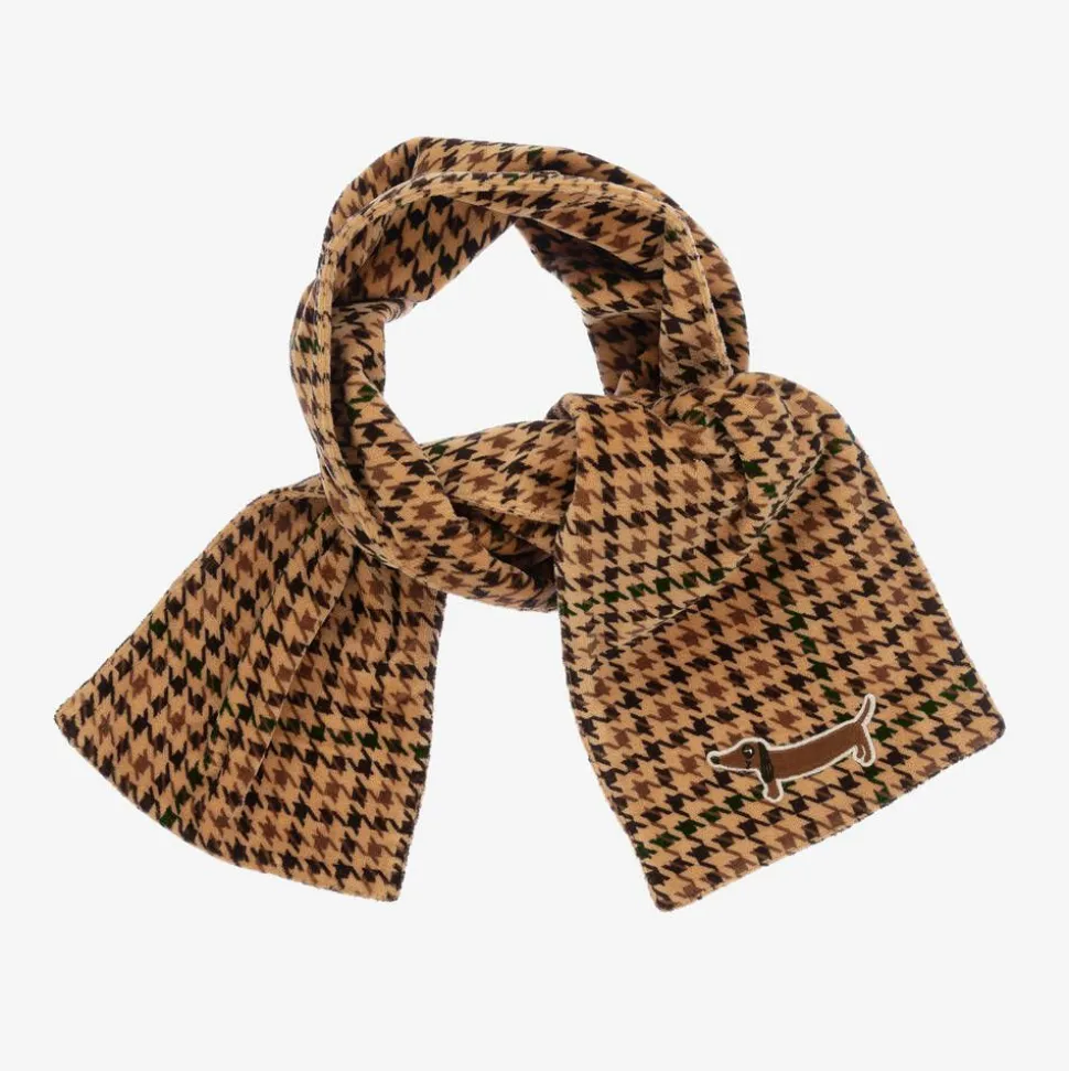 From Mini Rodini, dark beige scarf for boys and girls made from organic cotton. This cosy scarf has an all-over houndstooth pattern and a dog patch for a fun finish.