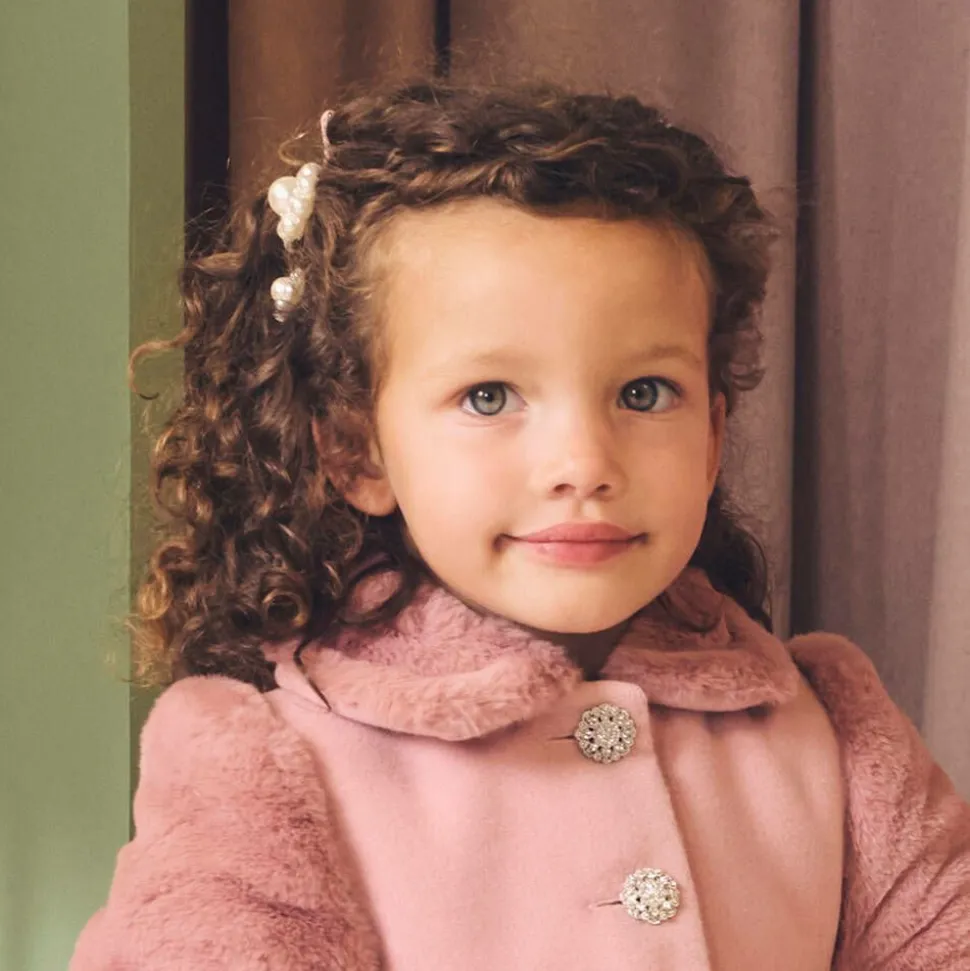 Girls three piece hair clip set by Milledeux, in a pretty shade of dusky pink. Crafted from soft grosgrain ribbon, each hair clip has delicate pearl bead trims and fastens with a small metal clip.