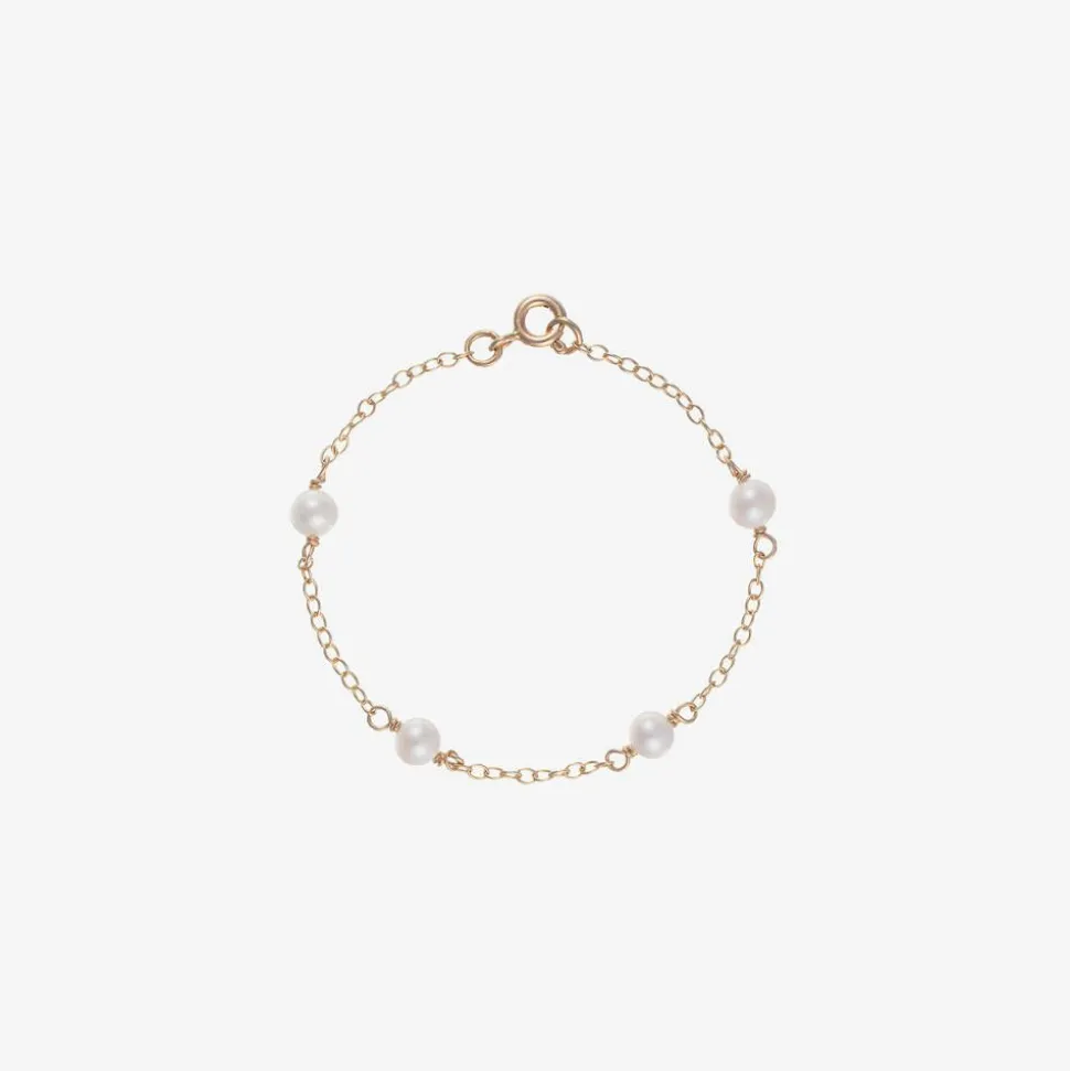 Timelessly elegant gold bracelet for girls from British label Raw Pearls, fastening with a metal clasp. The chain is made in luxurious 9-karat gold, with natural cultured river pearls. A thoughtful gift to be worn for years to come, it is presented in a soft velvet storage pouch.