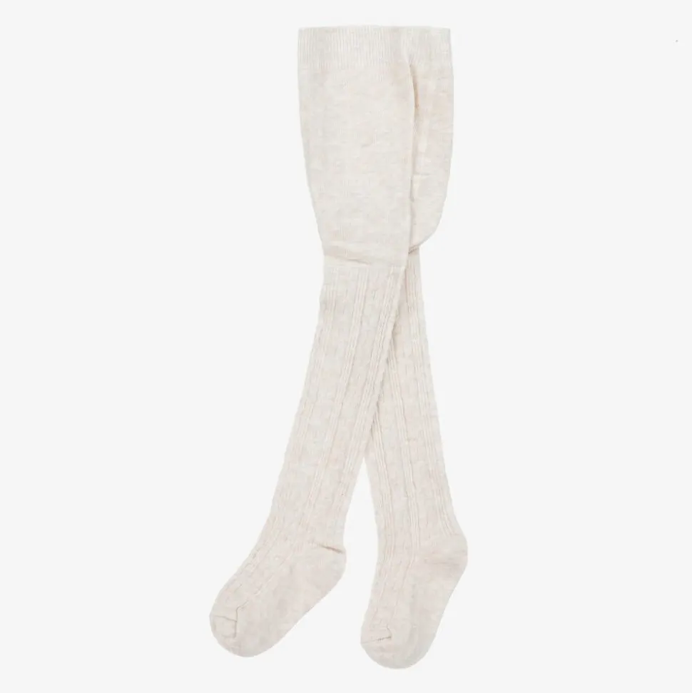 Light beige marl tights for little girls by Mayoral, knitted in a soft and stretchy cotton blend. Ideal for cooler weather, these comfortable tights have timeless cable knit patterns on the leg. This item contains organic cotton.