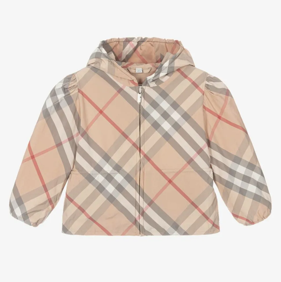 Unmistakably Burberry, this beige windbreaker jacket for girls is patterned in the luxury brand's pale stone check. Silky and lightweight, it is designed with lovely puffed sleeves, a zip-up front and a gently elasticated waist with internal toggles on both sides for an adjustable fit. There are two popper fastening pockets concealed on the side seam. The hood, cuffs and hem are elasticated to help keep the elements out. The main material of this product is made with at least 50% recycled content.