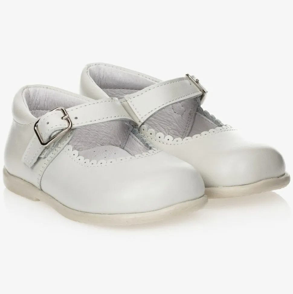 Exclusive to Childrensalon, a pair of ivory-beige leather shoes for girls by Children's Classics, with pretty scalloped edges. These timeless Mary Jane style shoes have soft leather lining, cushioned insole and a single buckle fastening, with non-slip rubber soles.