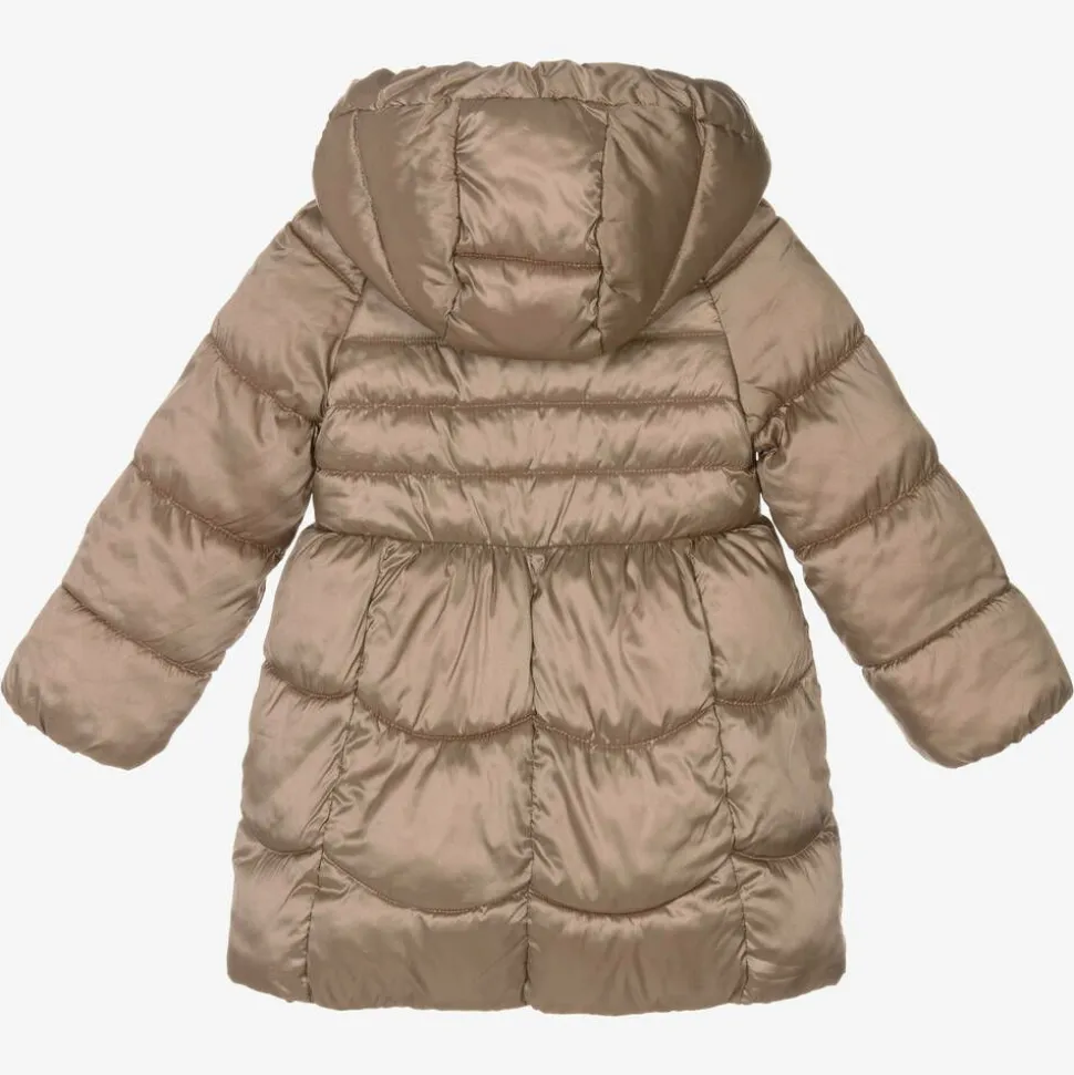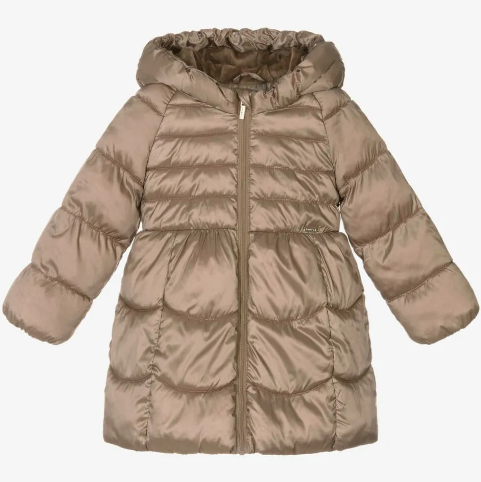 A beige puffer coat for little girls by Mayoral, made in a silky smooth recycled fabric. Great for keeping her warm, this zip-up coat has an elasticated hood and a fleece-lined bodice. There is a metal logo on the front.