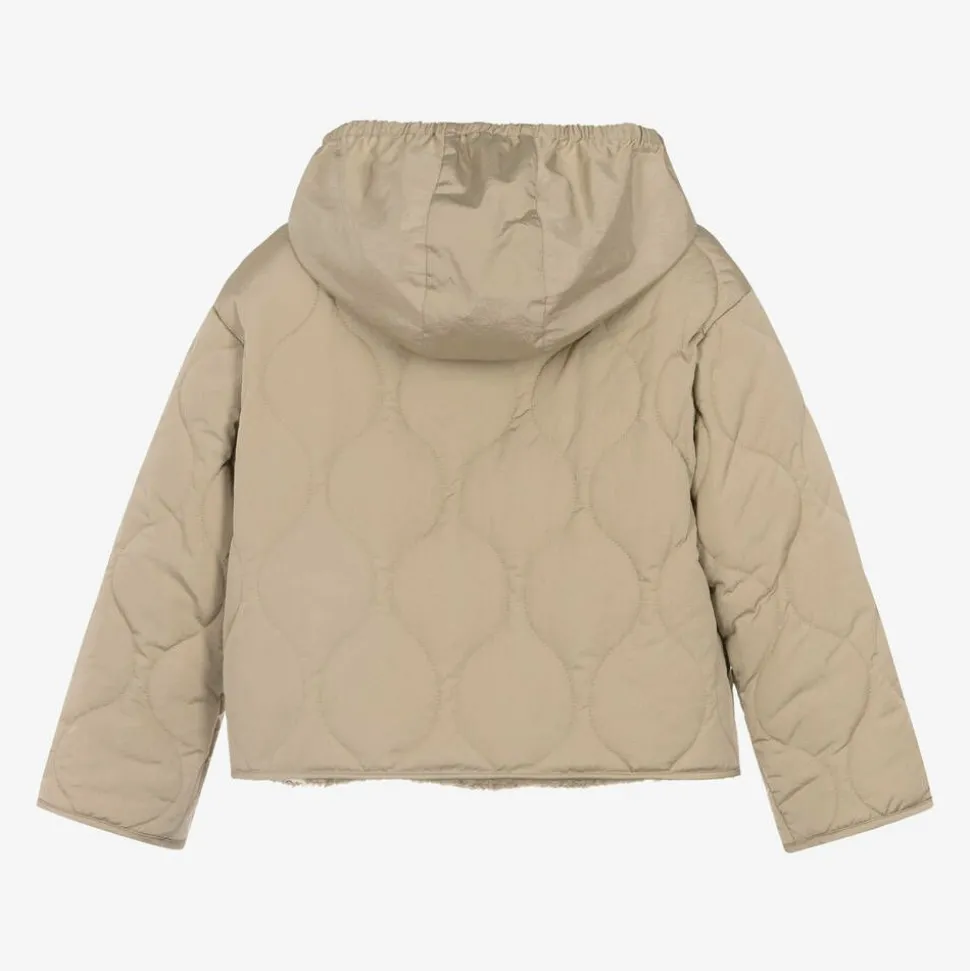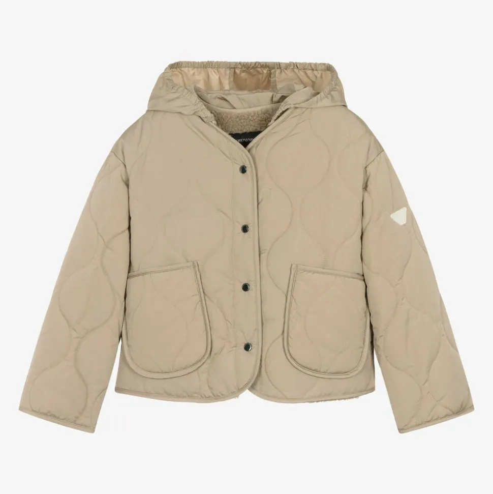 A soft and smooth beige quilted jacket for girls by Italian brand Emporio Armani. Gently padded for cosy comfort, it has a thick sherpa fleece lining for extra warmth. There is a lightweight fixed hood, tucking away neatly into an inner pocket when not in use. This stylish jacket has useful front pockets, lined in soft fleece for added warmth, a rubberised Eagle logo patch on one sleeve and poppers down the front for easy fastening.