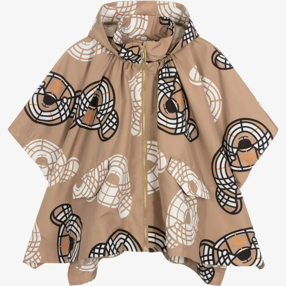Archive beige hooded cape for girls by Burberry, with the luxury British brand's distinctive Thomas Bear pattern in black and white. Oversized and lightweight, the cape has a detachable hood, a soft mesh lining and a branded gold metal zip fastening. There are useful popper-fastening front pockets and poppers down the sides to create short sleeves.