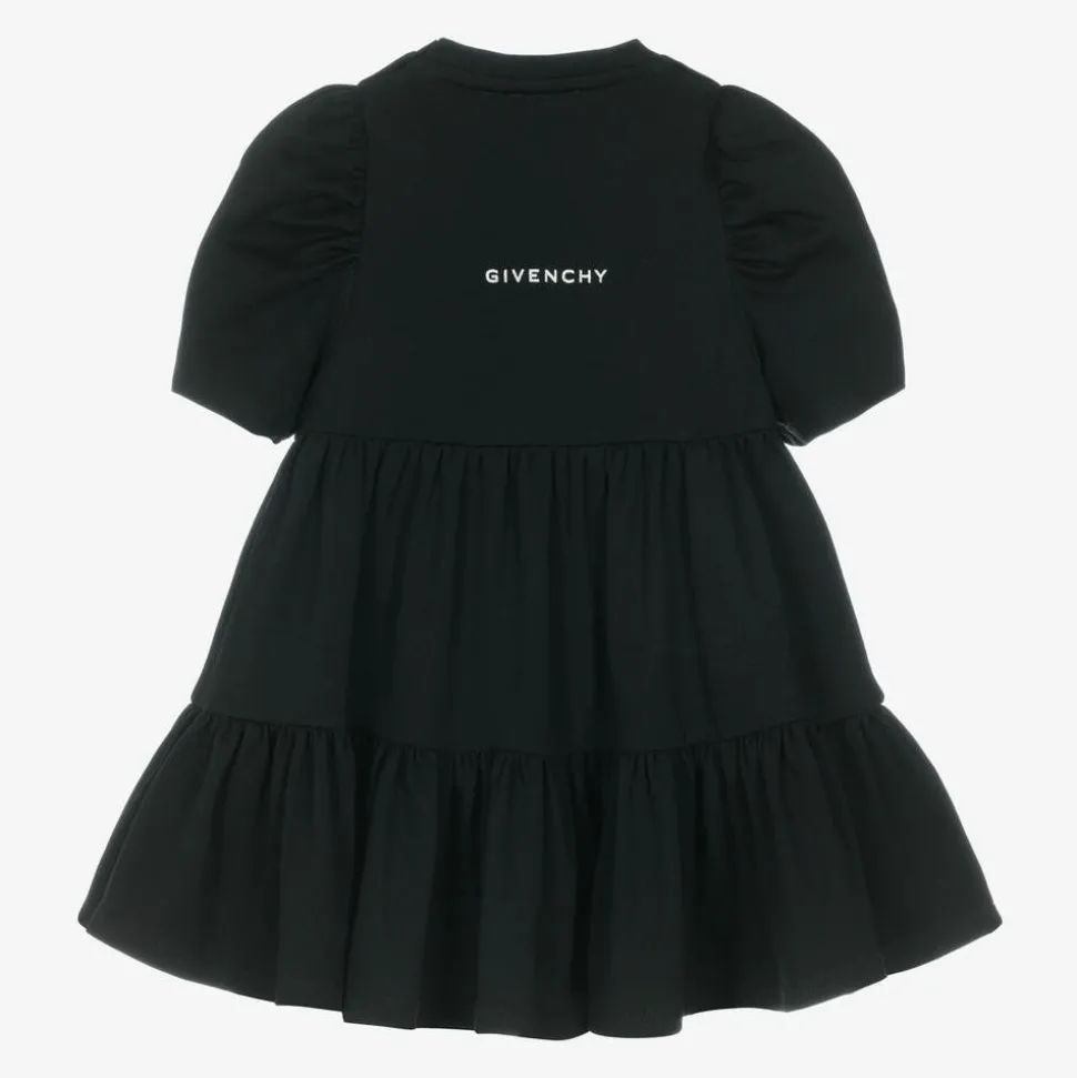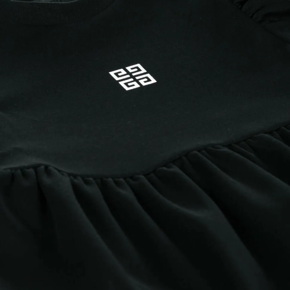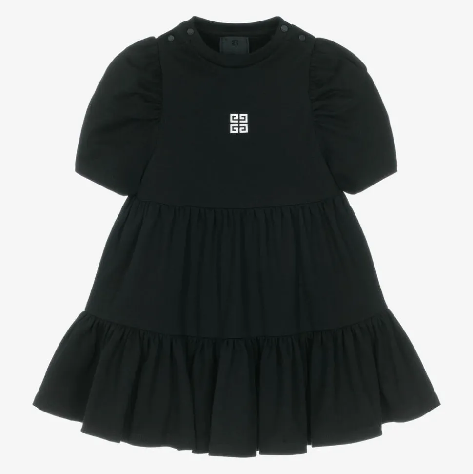 A black dress for little girls by luxury brand Givenchy, made in soft cotton jersey for comfort and wearability. This tiered design has short puff sleeves and easy popper fastenings on each shoulder to help with dressing. There is an iconic 4G logo on the front in metallic silver and further designer lettering on the back that glistens when it catches the light.