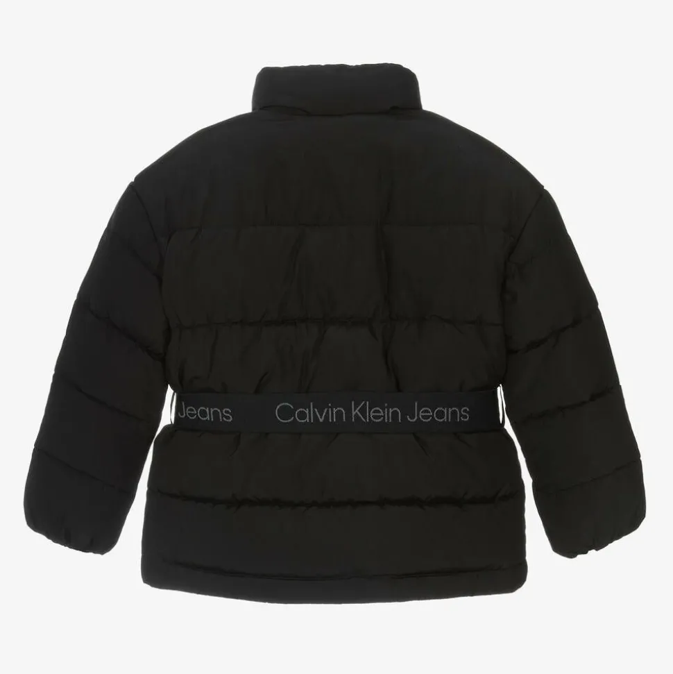 Black belted puffer jacket for girls by Calvin Klein, made in silky smooth fabric with mid-weight padding. Ensuring warmth during the colder months, this slim-fit design has a full zip front and long sleeves with elasticated cuffs. The stand-up collar is lined with cosy polar fleece and the silky interior is printed with a Calvin Klein Jeans logo. To shape the waist, the elasticated belt is fully adjustable and fastens with a branded clip buckle. A monogram logo, in tonal embroidery, adds further designer detail to the chest. The outer material and lining are made with at least 95% certified recycled material.
