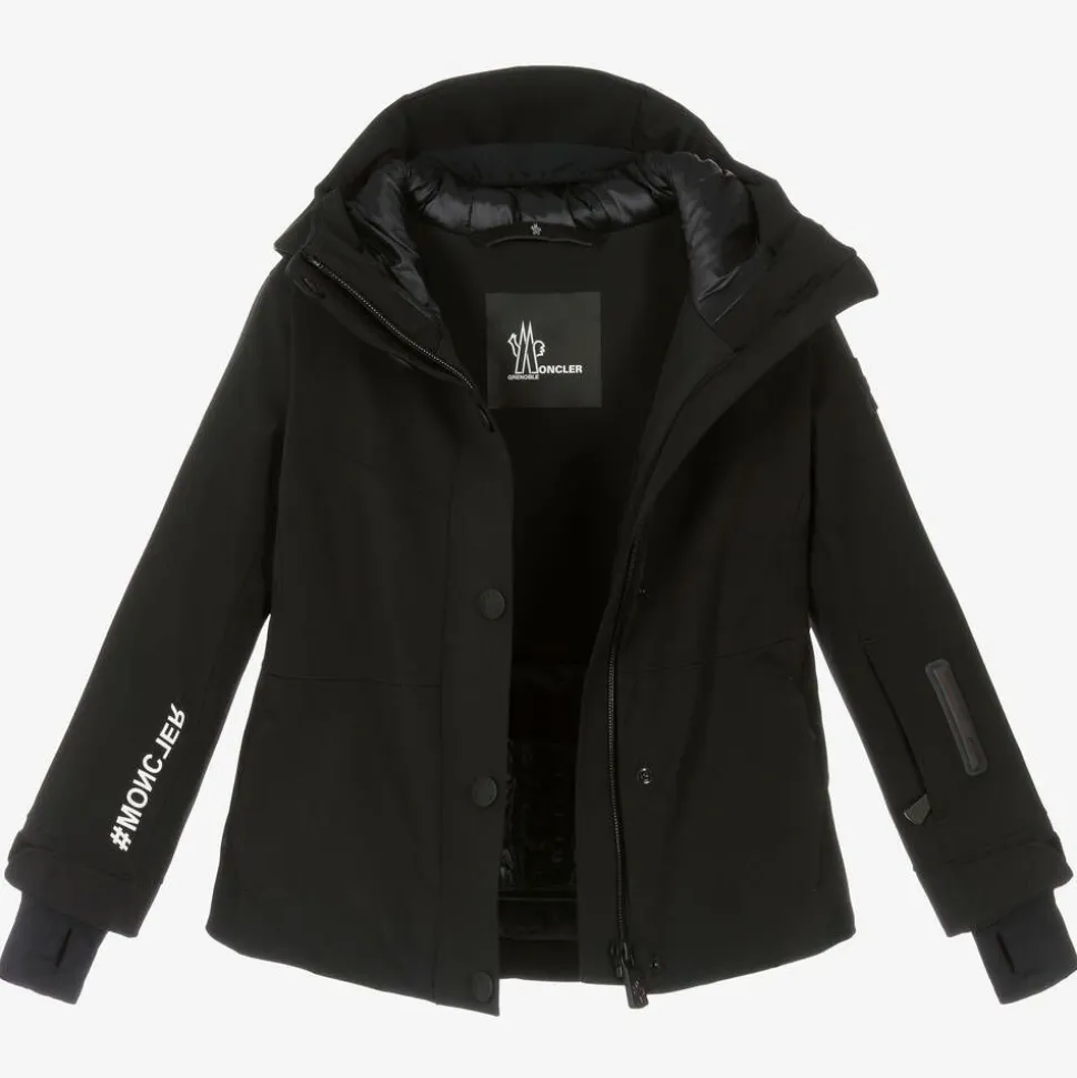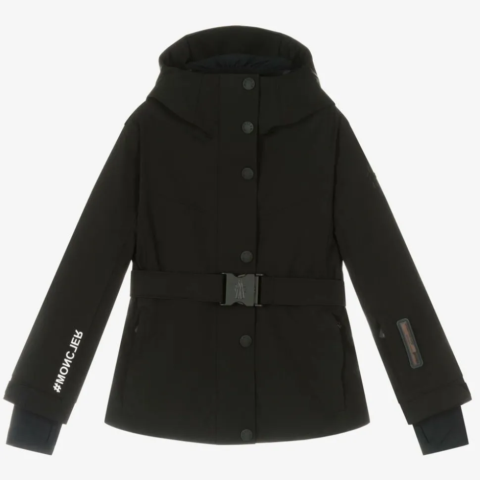 A black padded ski jacket for girls by luxury brand Moncler Enfant, part of the Grenoble collection and designed for high performance on the slopes. Windproof and water-repellent, this technical jacket has lightweight Primaloft padding for superior breathability and insulation. There are zip and popper fastenings on the front, with an internal popper fastening snow skirt to keep out the snow. The hood has a structured peak and an elasticated lining that fits comfortably over the helmet. There is a zip-up ski pass pocket on the sleeve, with RECCO reflector technology to help track and locate skiers in low visibility conditions. The wrists have adjustable velcro straps with internal thumbhole cuffs. A detachable buckle belt adds shape to the waist, and the iconic #MONCLER' logo on the sleeve adds adds a finishing designer touch.