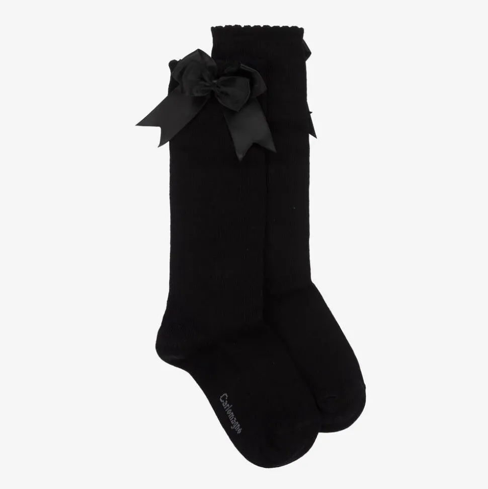 From traditional Spanish designer, Carlomagno these pretty black knee-high socks for girls are made from a soft cotton blend. They have a lovely satin ribbon at the side and an elasticated top for a comfortable fit.