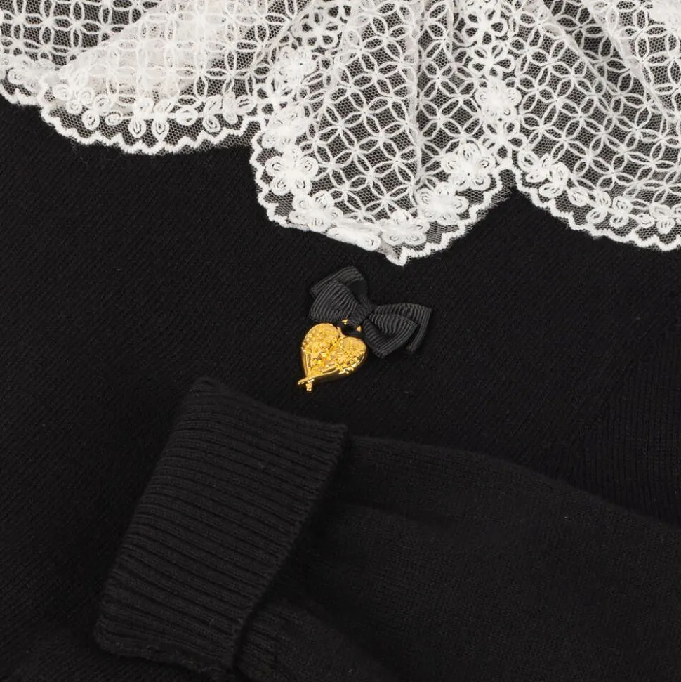 A softly knitted black cotton sweater for girls by Angel's Face. It features a beautiful floral lace white collar and pretty puffed sleeves. Fastening with a single heart button on the back, it has the brand's signature grosgrain bow and golden heart charm on the chest.