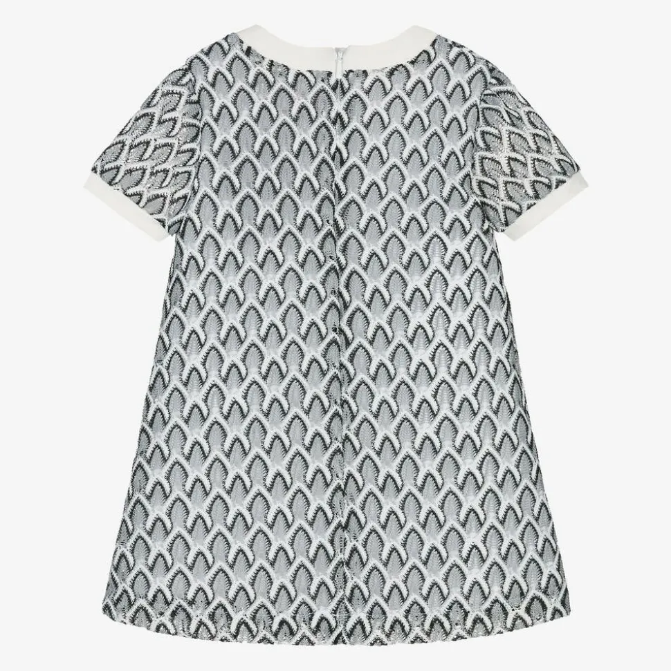 A lovely black and ivory short-sleeved dress for little girls by AIGNER. Made from lightweight crochet lace, it has a delightful scalloped leaf-inspired pattern in black, grey, and white shades. Fastening with a concealed zip on the back, it has a soft cotton lining and ivory jersey trims with black flower button embellishments. The patch stitched on the front features their signature 'A' horseshoe logo for a branded finish.