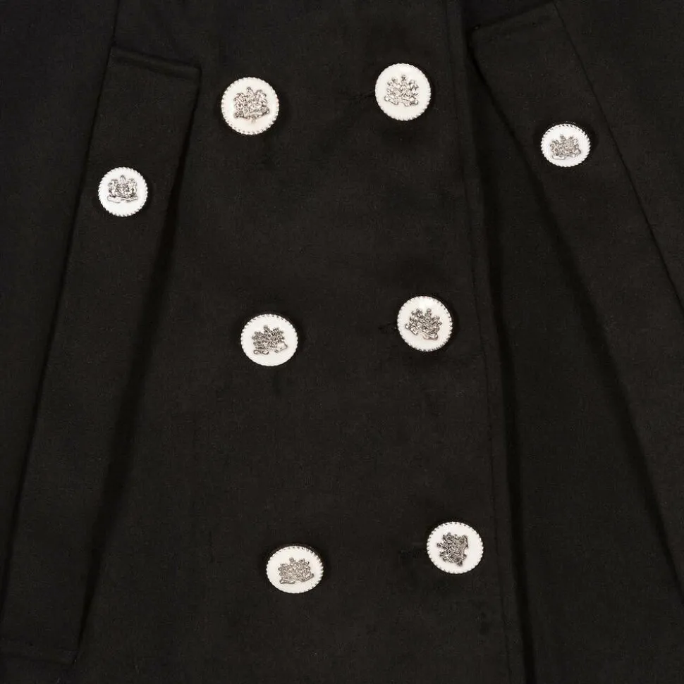 Smart black cape for girls by Romano, with a detachable faux fur collar. It has a soft felted feel and a satin lining. It fastens with decorative ivory and gold crest buttons and has matching buttons on the arm openings.
