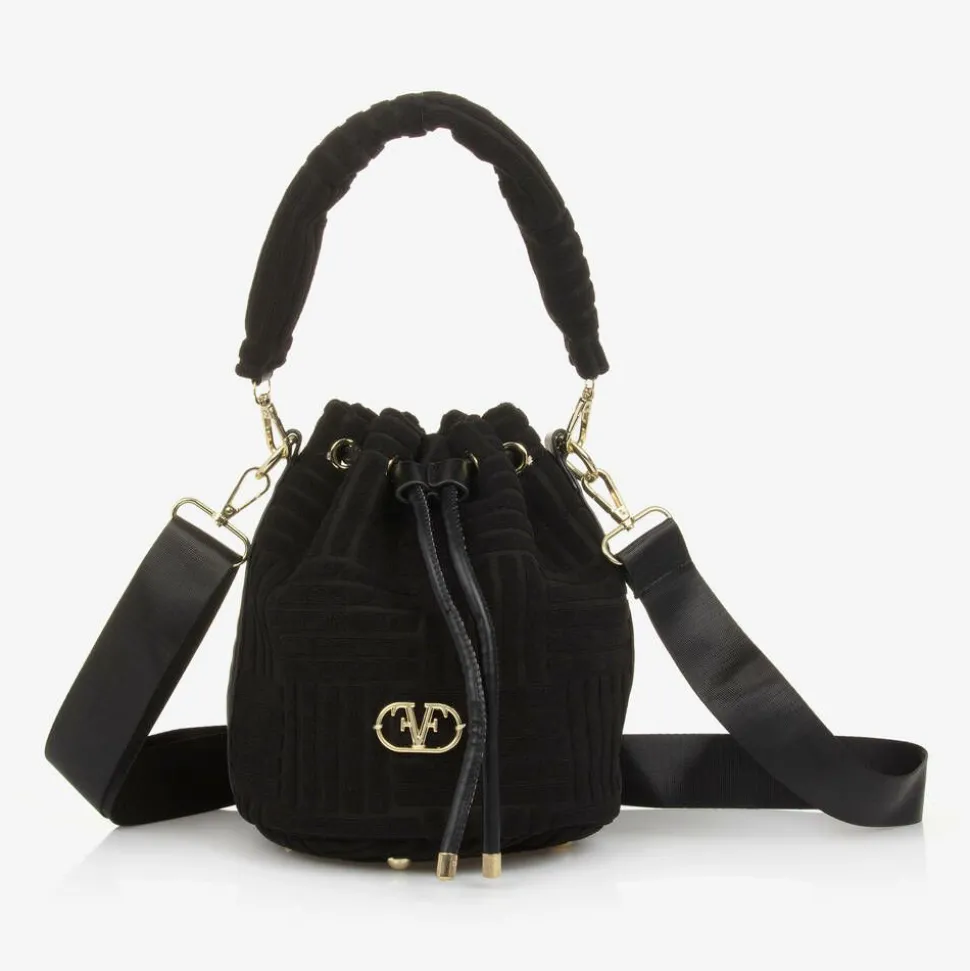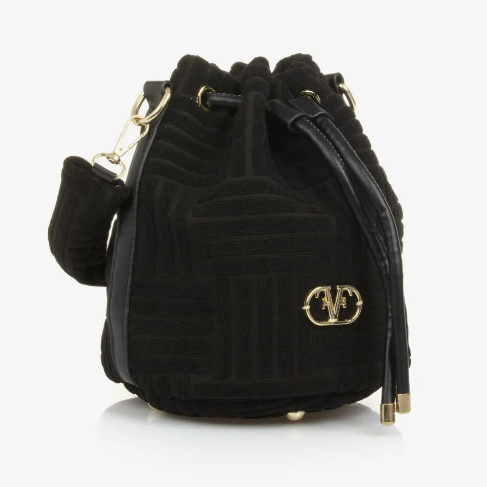 Stylish black bucket-style bag for girls by Fun & Fun, with tonal felted detailing. The spacious compartment can be secured with the drawstring fastening and a choice of two straps means it can be worn as a shoulder or handbag.