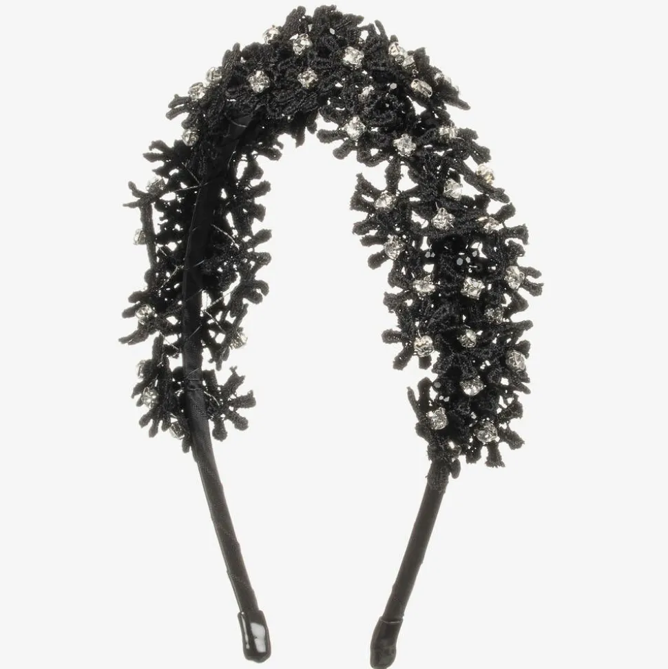 A stunning handmade hairband by Sienna likes to party. The band is covered with black satin and it has beautiful black lace flowers with sparkly diamanté.