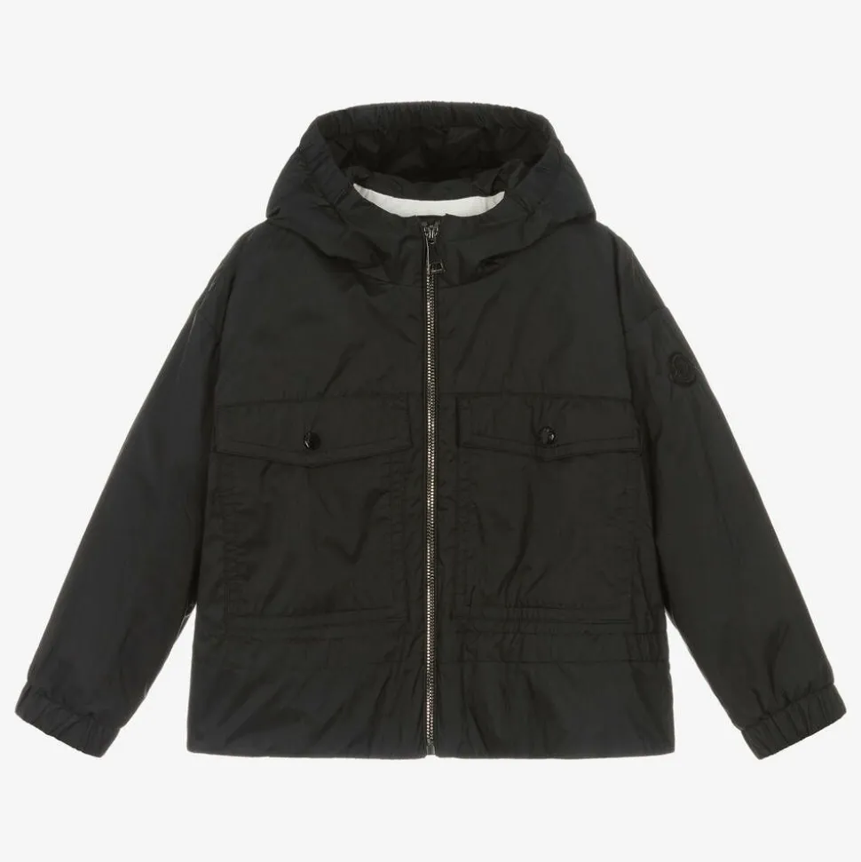 A black technical hooded jacket for girls by luxury French brand, Moncler Enfant. It is made in the designers signature longue saison fabric, which is silky smooth and lightweight for protective comfort. Neatly fastening with a zip, there are popper fastening pockets, and a tonal logo patch on the arm. An adjustable toggle is featured inside, designed to cinch in the waist for shape and warmth.