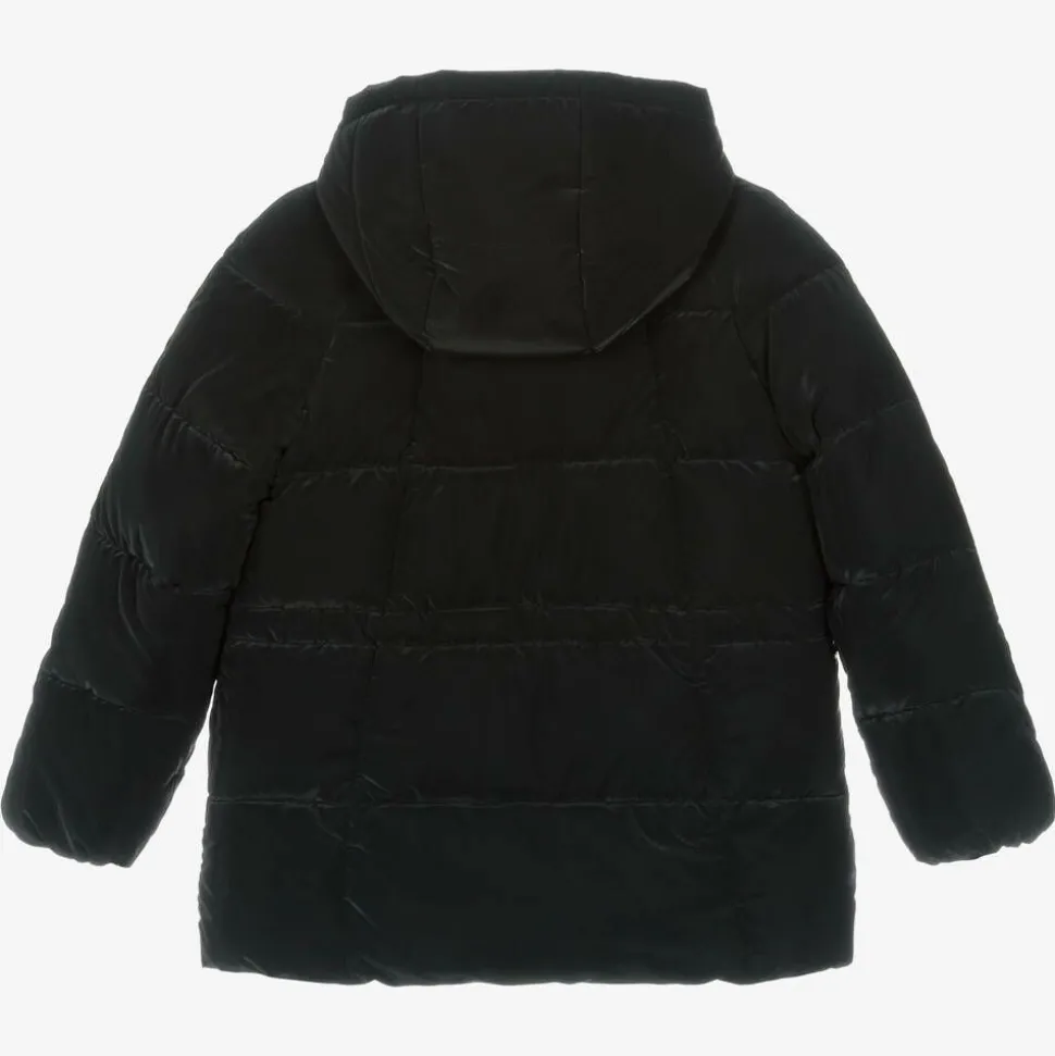 A black puffer coat for older girls from Mayoral, with gold-tone hardware. This hooded coat is made in silky soft fabric and padded with mid-weight insulation for extra cosiness. It has convenient front pockets, a soft polar fleece lining for warmth and a drawstring detail on the waist for the ideal fit.