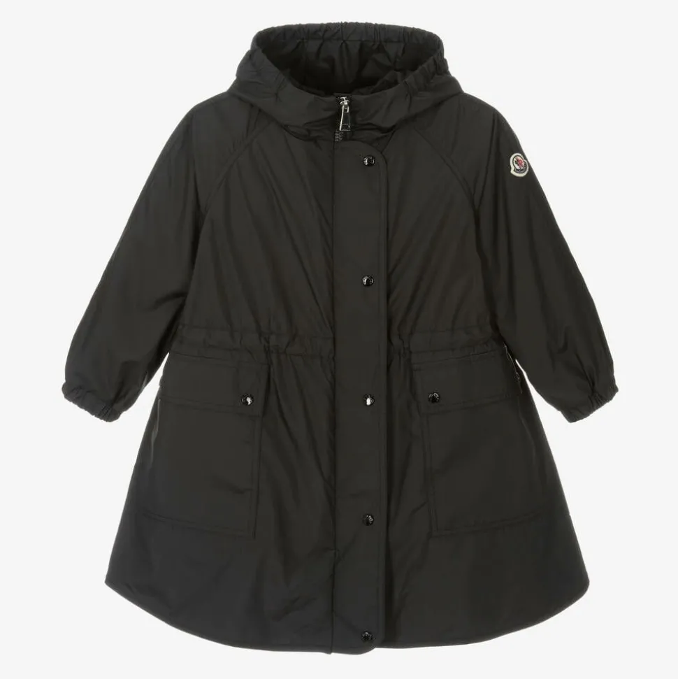 Versatile black hooded 2-in-1 coat and gilet for girls by Moncler Enfant. The lightweight coat has a fixed hood, with patch pockets on the front secured with branded poppers. The signature logo badge is on one sleeve for instant brand recognition, it has gently elasticated cuffs and fastens with a zip and branded poppers on the front. There is an internal drawstring on the waist for a comfortable fit. Inside is a silky, lightly padded gilet, kept in place with zips and poppers. It can be worn separately, or as an extra layer in chilly weather. It has a signature logo badge and useful patch pockets.