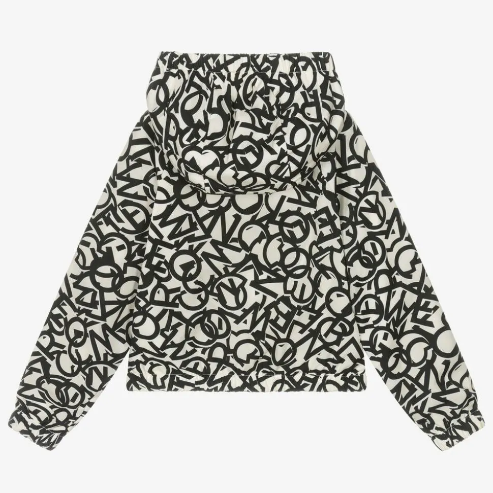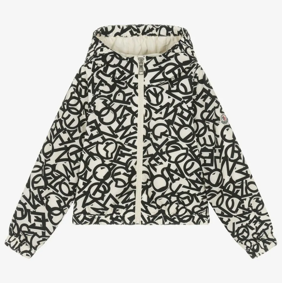 A black and ivory jacket for girls by luxury brand Moncler Enfant, with a bold logo pattern. Smooth and lightweight, this hooded jacket is fully lined for extra comfort and fastens with a branded zip on the front. The pockets hidden in the side seams fasten with poppers and there is an iconic patch on one sleeve for a signature finish.