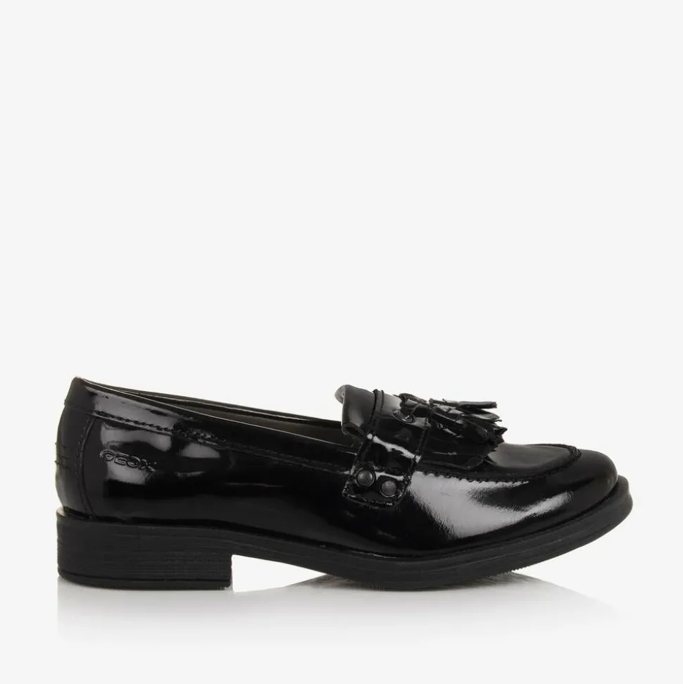 Girls patent leather loafers by Geox, with classic fringing and tassel detail. Ideal school shoes, they are breathable, antibacterial and shock absorbing. They are waterproof, and have a non-slip, non-marking rubber sole.