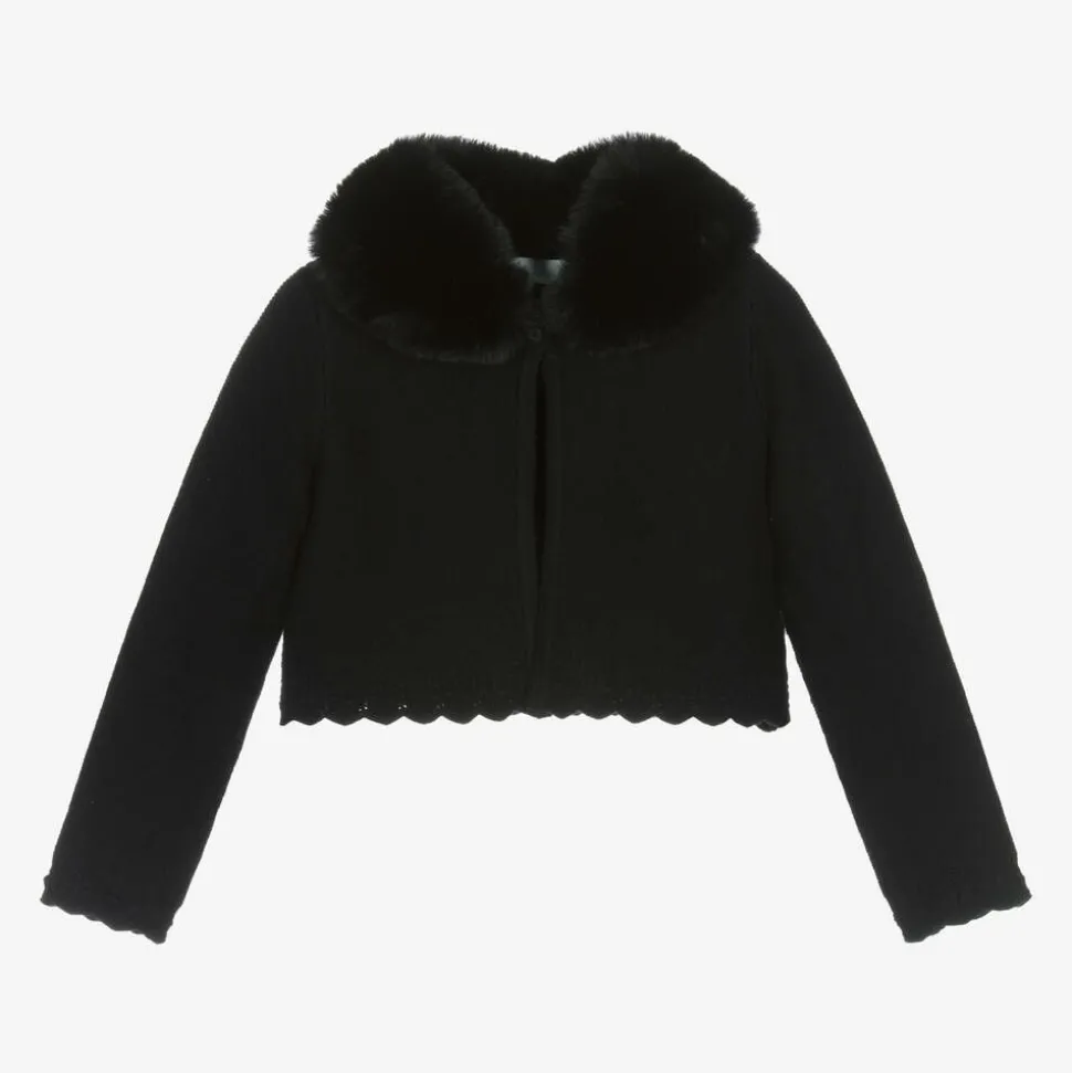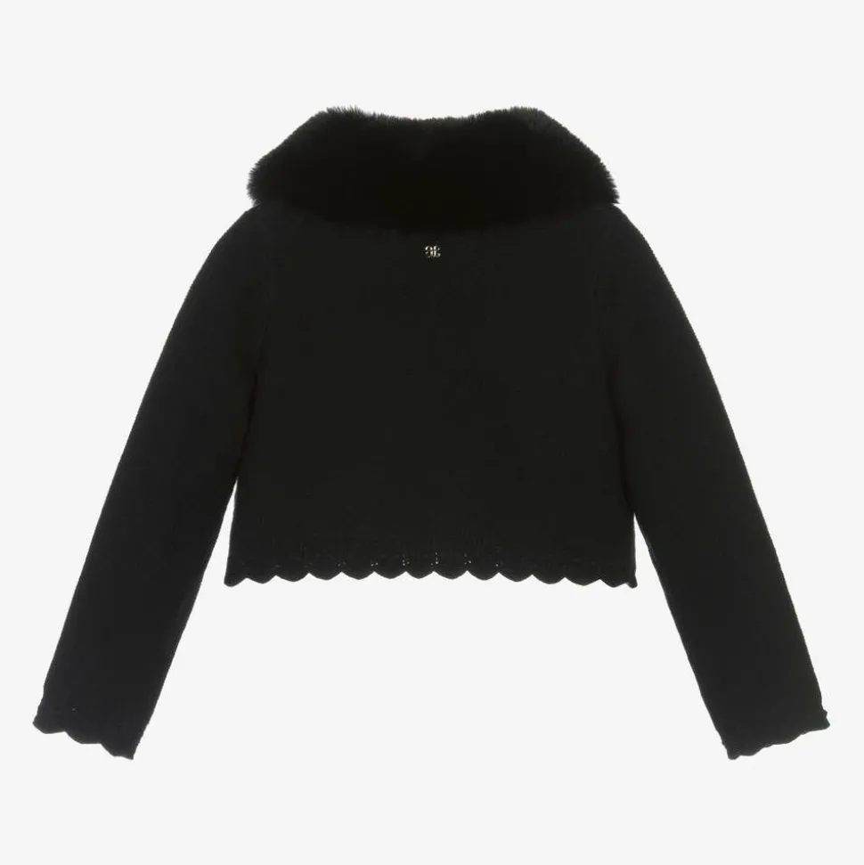 Lovely black knitted cardigan for girls by Abel & Lula, fastening with a single button on the front. It has an elegant plush collar which can be fully detached with buttons for an alternate look. There is sweet scalloped edging on the hem and the cuffs.