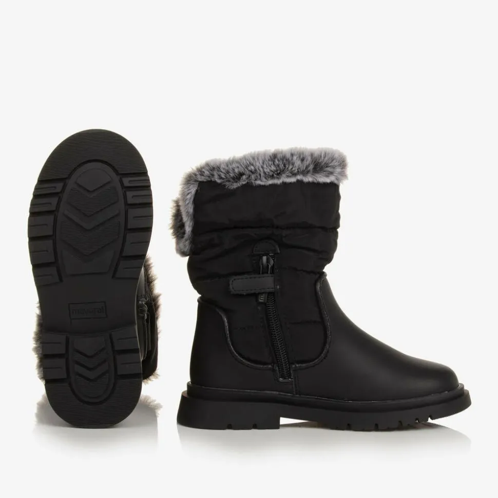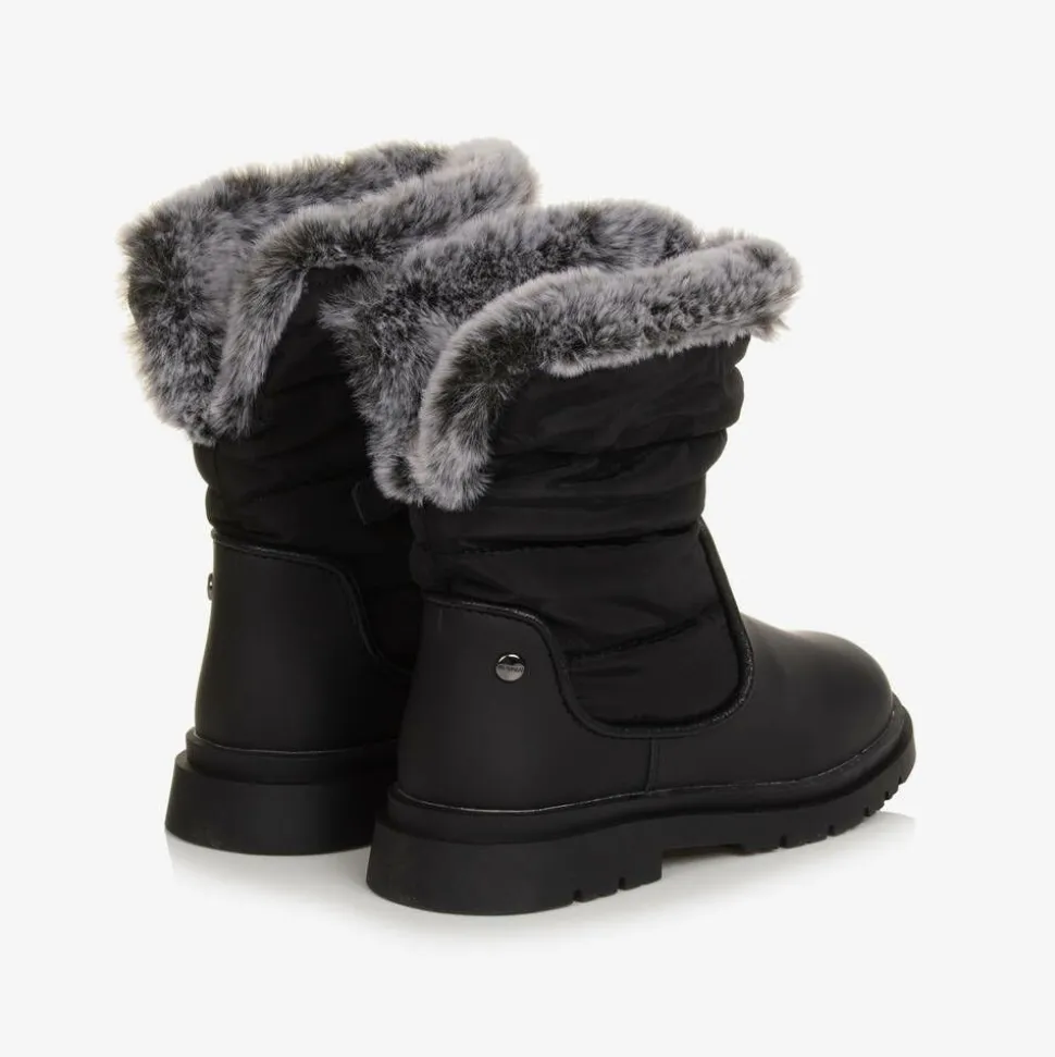 From Mayoral, black leather snow boots for girls lined with super soft faux fur. Warm and cosy, these lovely boots can be folded down for an alternative look.