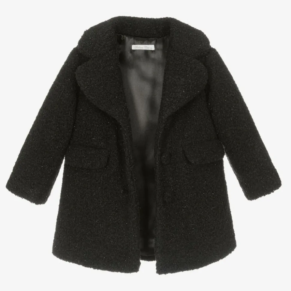 Smart and cosy, a black coat for girls by Balloon Chic, sparkling with shiny thread. Made in mid-weight bouclé, it has a wide lapel collar and front flap pockets. It fastens with bouclé-covered buttons and is lined in soft satin.