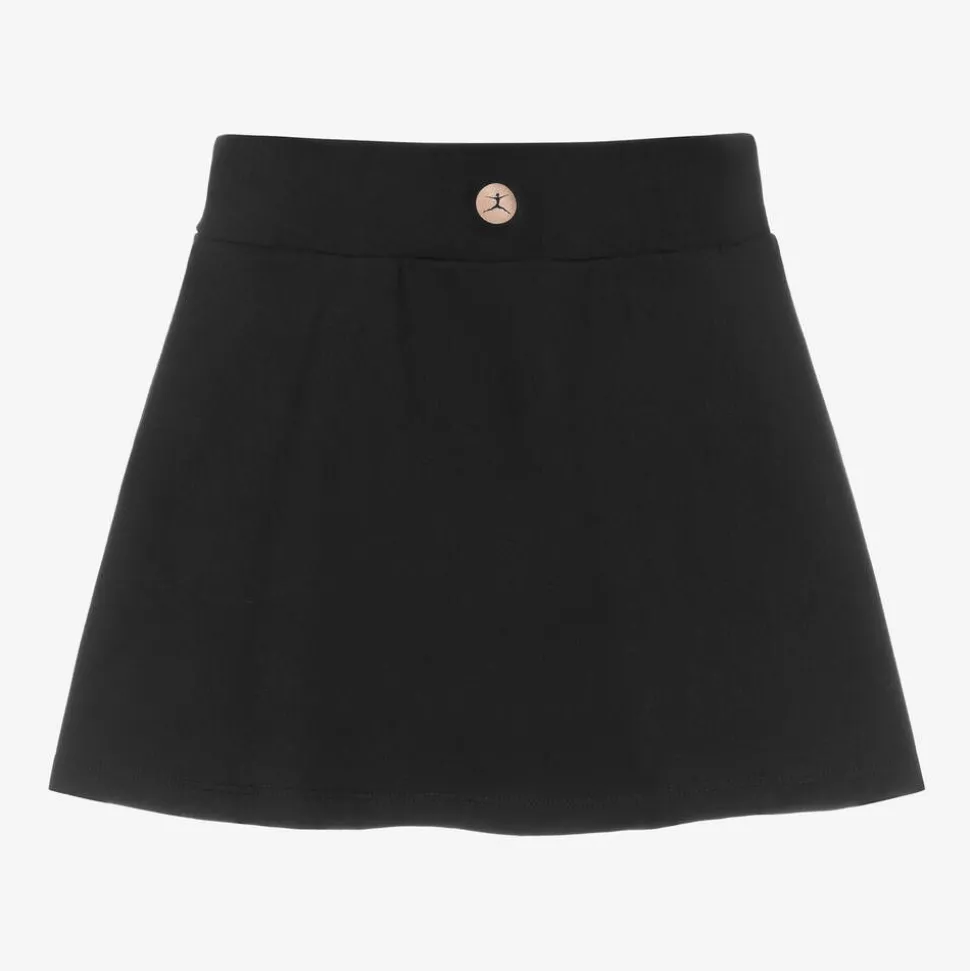 Black activewear skort for girls by American designer, Danskin. Lovely for exercise, the super soft and stretchy fabric has four-way stretch and is great for free movement. It is designed to look like a skirt, with useful shorts underneath. The wide waistband is ideal for a comfortable fit, and is stamped with rose gold branding on the back.
