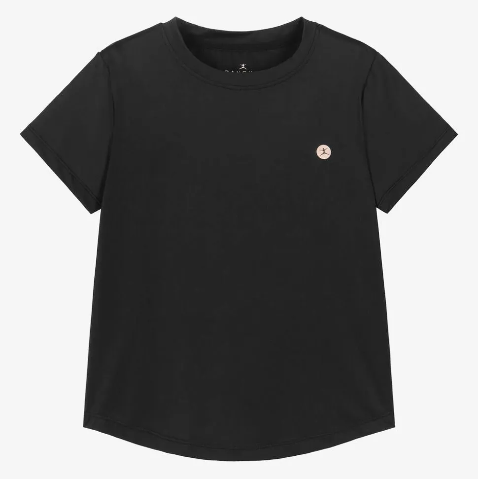Black activewear top for girls by American designer, Danskin. Lovely for exercise or dancing, the super soft and stretchy fabric has four-way stretch and is great for free movement. A rose gold logo print on the front adds a branded touch and the scoop hem adds style.