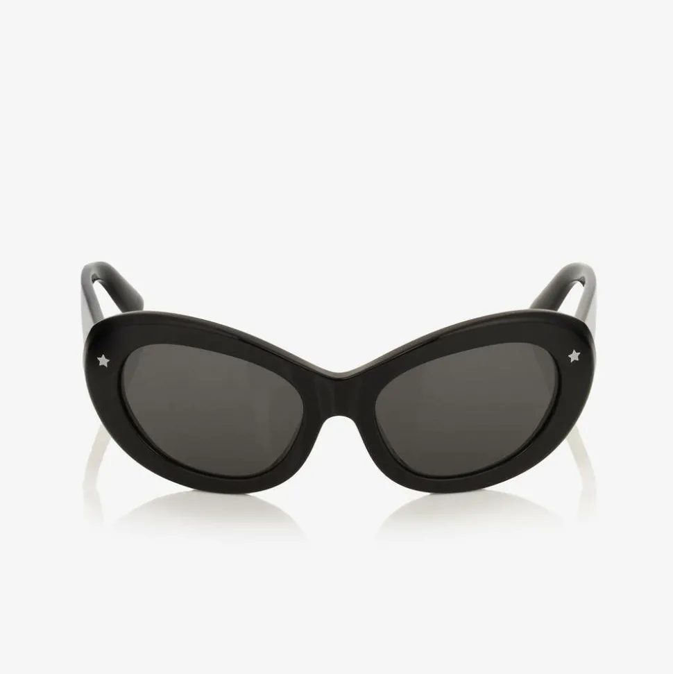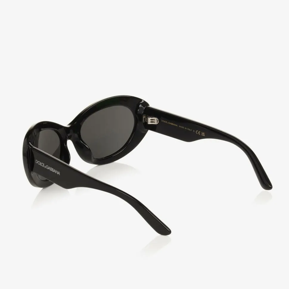 Stylish black sunglasses for girls by luxury Italian brand Dolce & Gabbana. The chunky, oval frame has a little white star design on each side and dark grey tinted lenses, made with optical precision to protect little one's eyes. Adding a luxury touch to these sleek accessories, the designer's white logo is stamped on the wide statement arms and they come with a branded silicone case for safe storage.