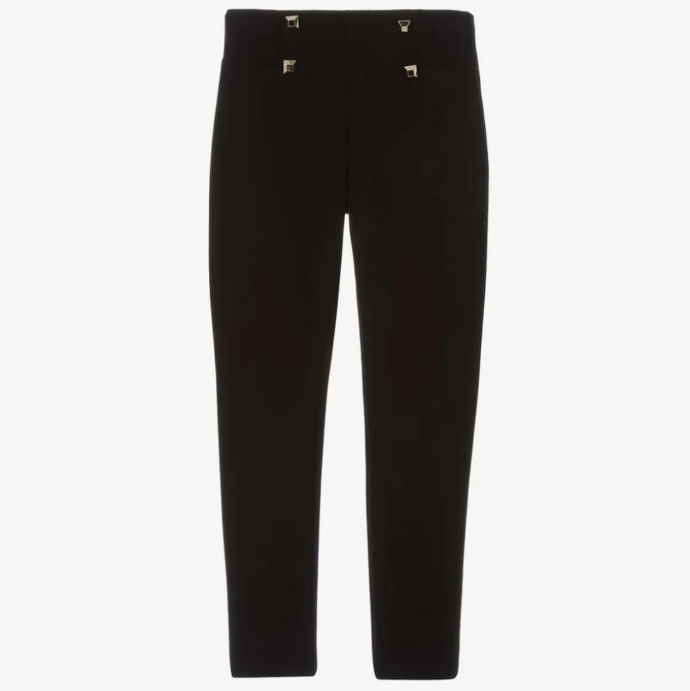 Black full-length leggings for older girls from H.Love by Fun & Fun. Made from a soft viscose-blend Milano jersey, they have shiny gold stud-inspired button embellishments on the front for an edgy finish. The waistband is elasticated to ensure a comfortable fit.