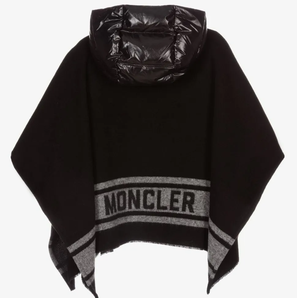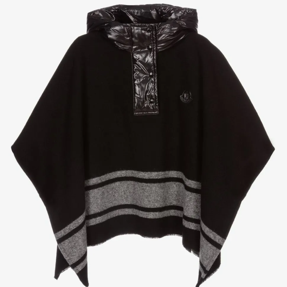 Girls black poncho by French luxury brand Moncler Enfant, with contrast grey stripes on the hem. Made in a soft felted wool blend for superior warmth and insulation, it has a down padded nylon hood with popper closure at the neck. The brand's iconic black logo patch is on the front.