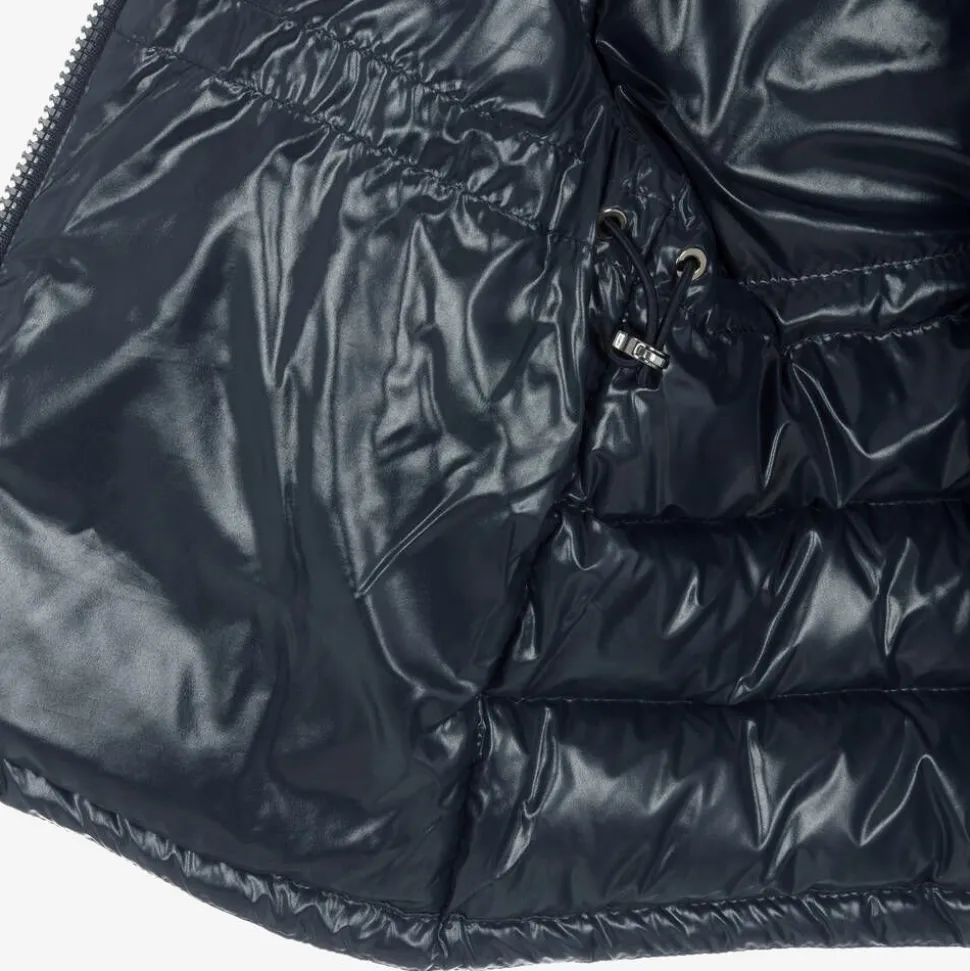 Silky smooth with a shiny finish, this navy blue puffer gilet for girls is by luxury brand Moncler Enfant. Water repellent and breathable, it is padded with lightweight down for superior comfort and warmth. It has an exposed front zip fastening, a detachable hood for extra cosiness, with useful zipped pockets on the front. The designer's iconic felt logo badge is on the chest for a signature finish.