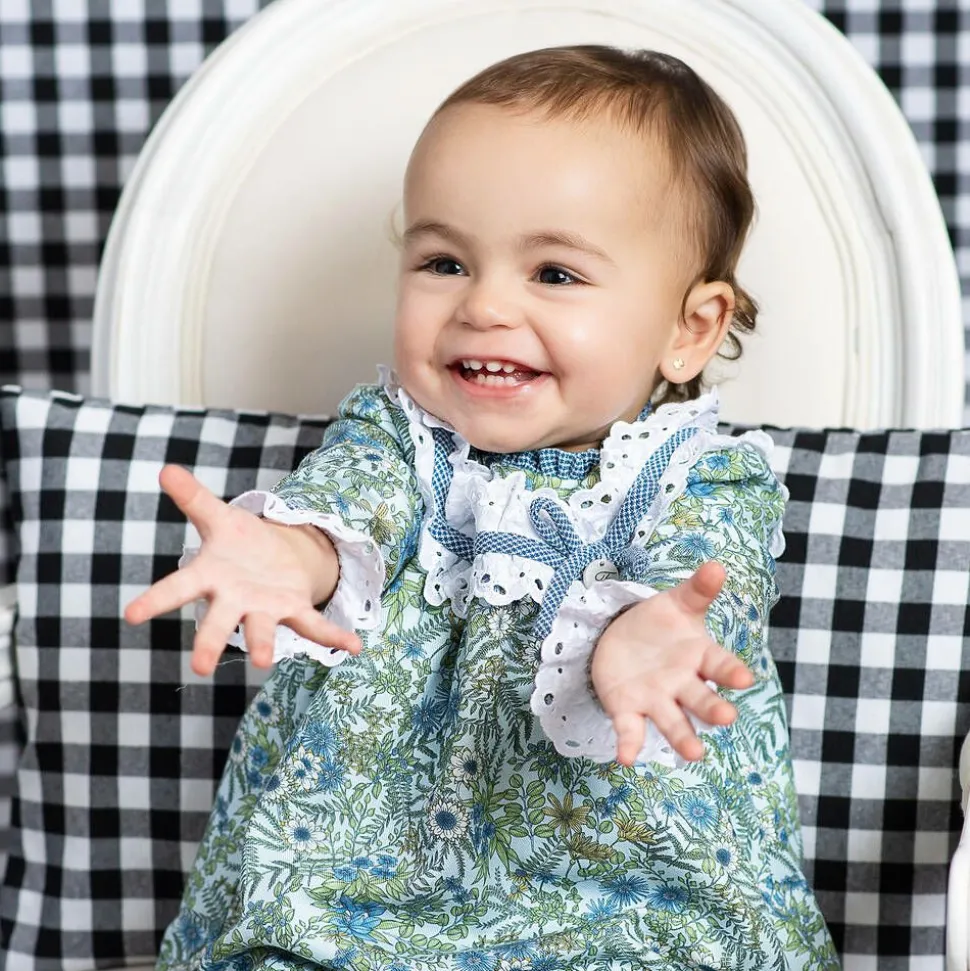 Gorgeous blue and green cotton dress for little girls by classic Spanish brand Foque, with a beautiful floral print. Made in a soft, cotton-blend twill, it has a stand-up blue gingham collar and a white lace-edged bib with a blue gingham trim and bow, embellished with a logo charm. There are matching trims on the cuffs, a voile lining for comfort and button fastenings on the back. The dress comes with useful, coordinating, blue gingham bloomers.