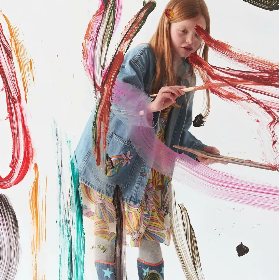 Blue denim jacket for girls by Stella McCartney Kids, made in soft organic cotton. It has colourful star, rainbow and floral embroidery and appliqués on the front and back, with a pink, blue and green retro 'STELLA' logo on the chest. This loose-fitting, casual jacket has useful front pockets and branded button fastenings on the front and cuffs for a discreet designer finish. The Stella McCartney fit can be quite small so choose a size up if you want room to grow.