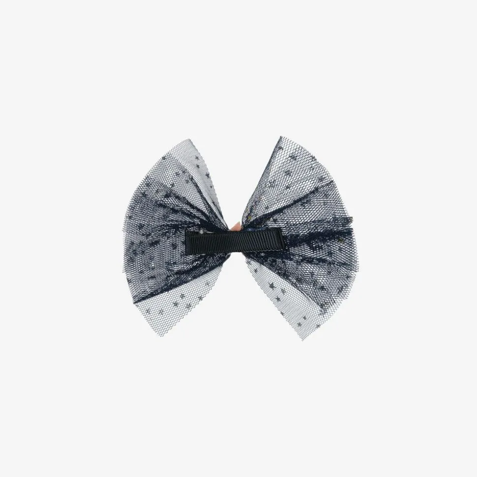 Great for parties, this navy blue hair clip is from Bowtique London. The handmade tulle bow is decorated in glittery gold stars with a charm in the centre. It is set on a fabric-covered clip for comfort.