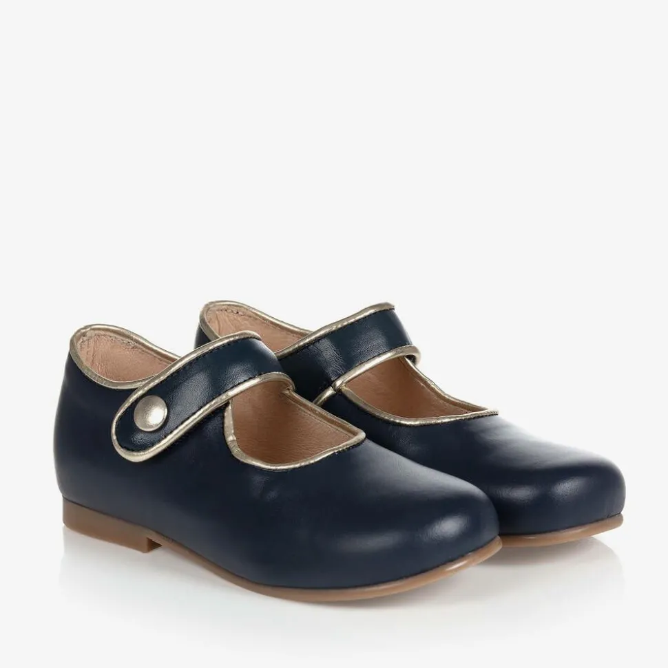 Exclusive to Childrensalon, a pair of smooth navy blue leather Mary Jane shoes for girls by Children's Classics. They have shiny gold trims, with a velcro strap across the foot and a faux gold button. They are fully lined in leather and have a non-slip outer sole.