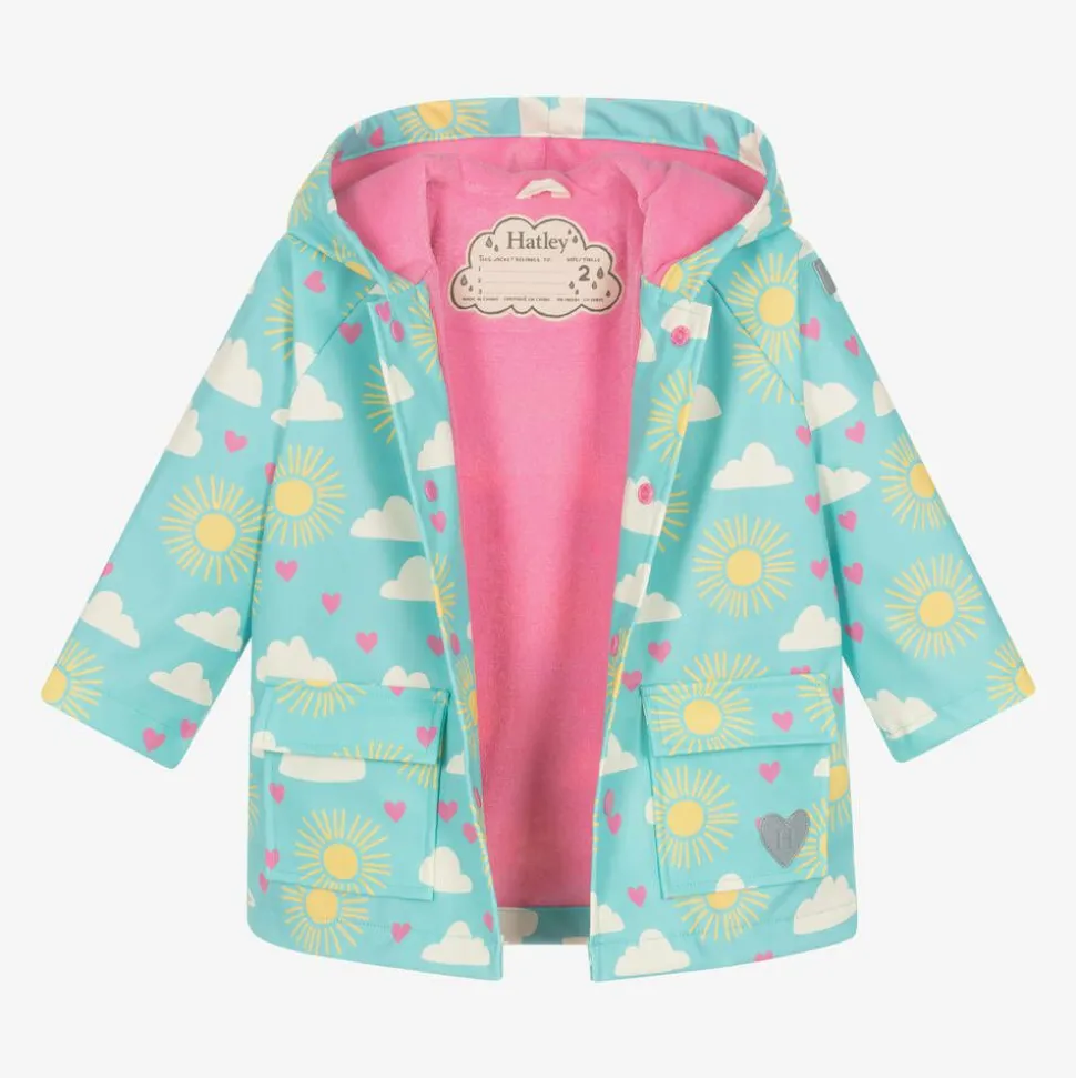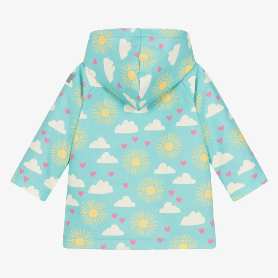 An aqua blue hooded raincoat for younger girls by Hatley, printed with a lovely sky design, featuring sunshine, pink hearts and clouds. Practical to wear on rainy days, it has a smooth waterproof coating and light reflective logo patches with a soft pink terry towelling lining for extra comfort. It fastens with pink poppers on the front.