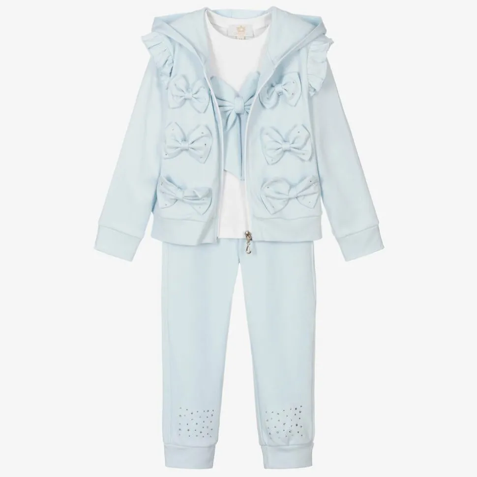 Stunningly casual, a pale blue cotton jersey tracksuit set for girls, by Caramelo Kids. The zip-up hoodie is decorated with ruffles and bows, whilst the matching trousers have diamanté detailing for added sparkle. This tracksuit pairs comfortably with a white long-sleeved T-shirt, which is finished with a pretty bow.