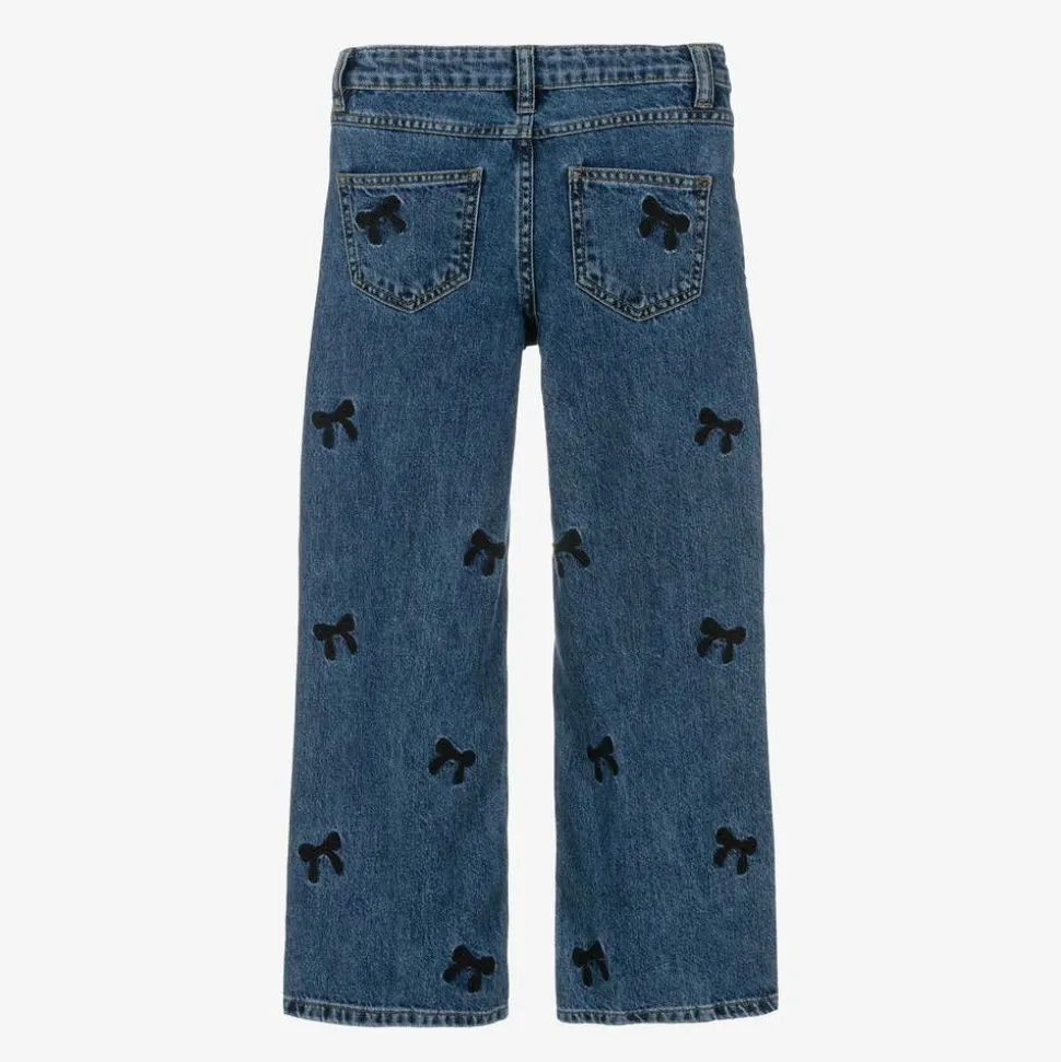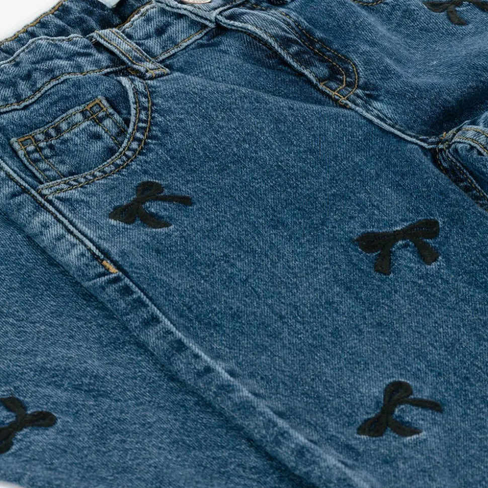 Mid-blue wash wide-leg jeans for girls by Name It, made from denim with organic cotton. They are embroidered with pretty black bow motifs, adding a touch of sweetness to this casual style. Complete with the classic five-pocket styling, they fasten with a zip and clasp on the front and have an adjustable waist for a comfortable fit.