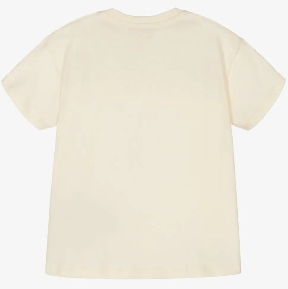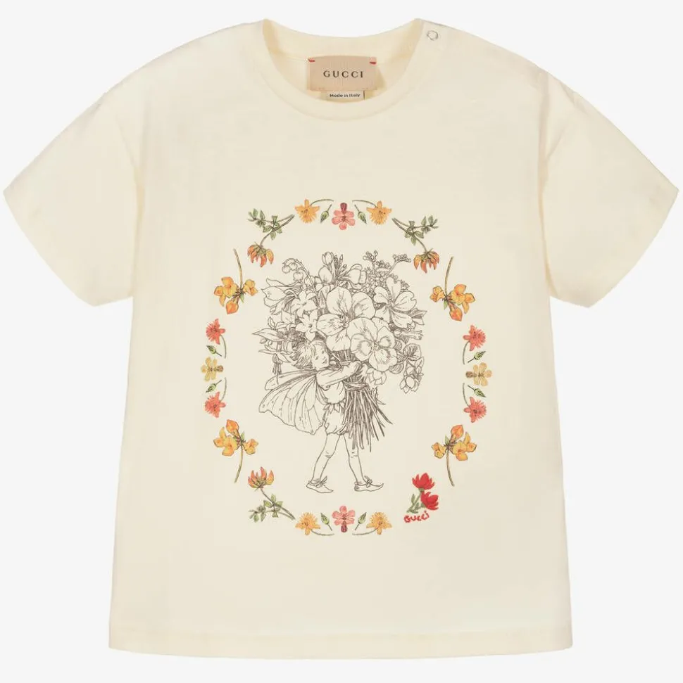 A lovely ivory T-shirt for little girls by luxury Italian designer Gucci. In collaboration with Cicely Mary Barker, it has a beautiful flower fairy illustration in pink and orange on the front. It is made in soft and comfortable cotton jersey, with shoulder popper fastenings for easy dressing.