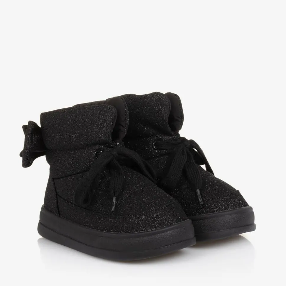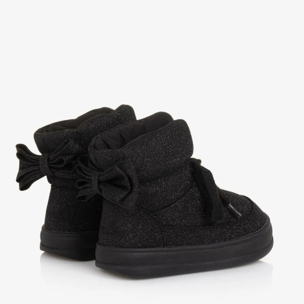 Gorgeous glittery black quilted ankle boots for girls from Monnalisa, with a decorative bow and embroidered logo on the back. For extra warmth, they are lined in soft and cosy faux fur, with a drawstring fastening providing an adjustable fit. The chunky, non-slip rubber outer sole ensures good grip on slippery surfaces.
