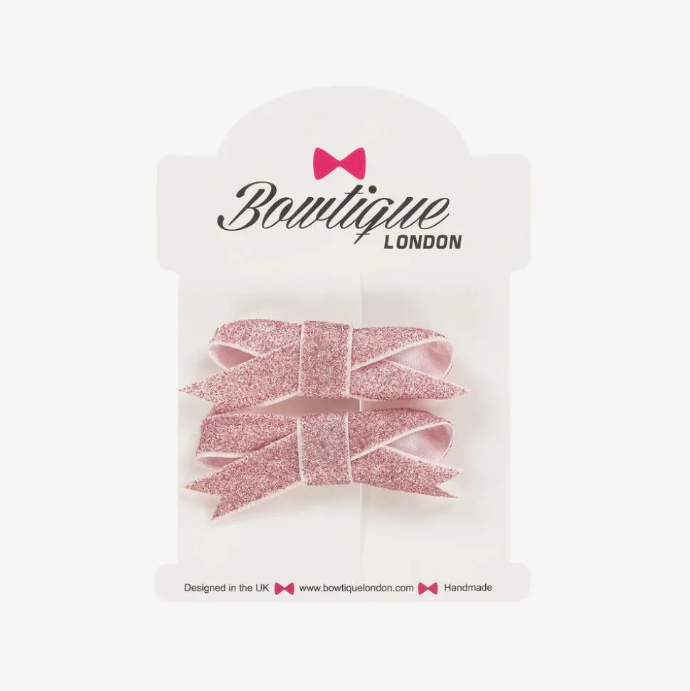 Two lovely hair clips for girls by Bowtique London, decorated with glittery pink ribbon bows. Set on a metal clip, they are easy to slide to keep hair in place.