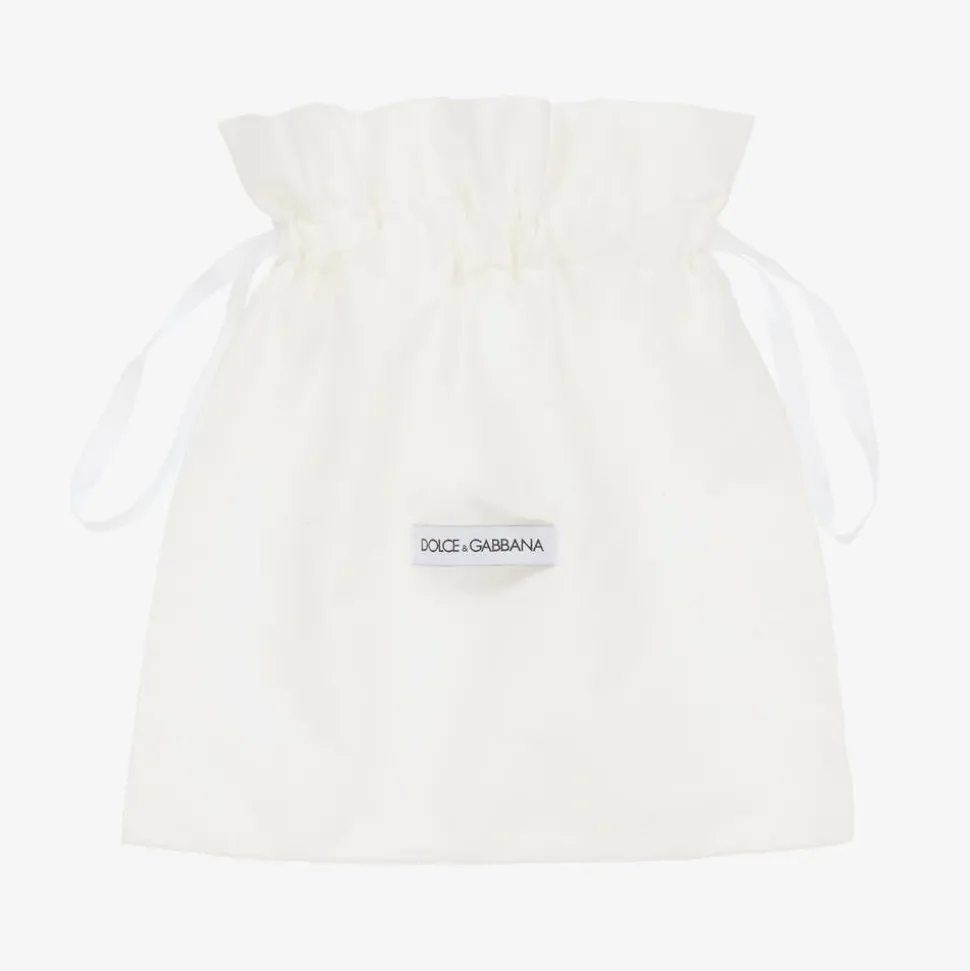 Glittery silver ballerina pumps for girls by luxury label Dolce & Gabbana. Lovely for those special occasions, these elegant pumps are trimmed on the front with a dainty bow and silver metal DG logo. Made and lined in fine leather, they have a lightly cushioned insole for lasting comfort and a rubberised, non-slip outer sole for improved grip.