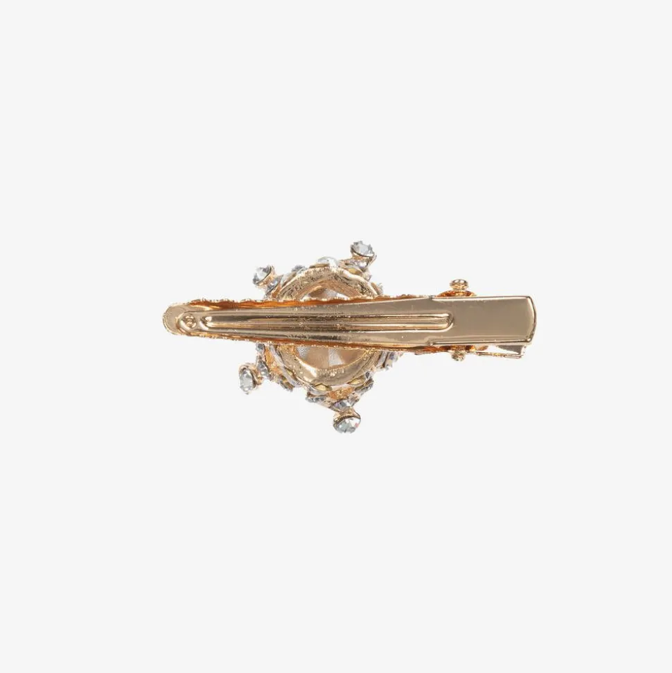Lovely for glamorous occasions, this golden hair clip for girls is by Bowtique London. The crown design has a sparkly jewel centre and diamanté decorations for added shine. It has an easy-to-use metal clip fastening.